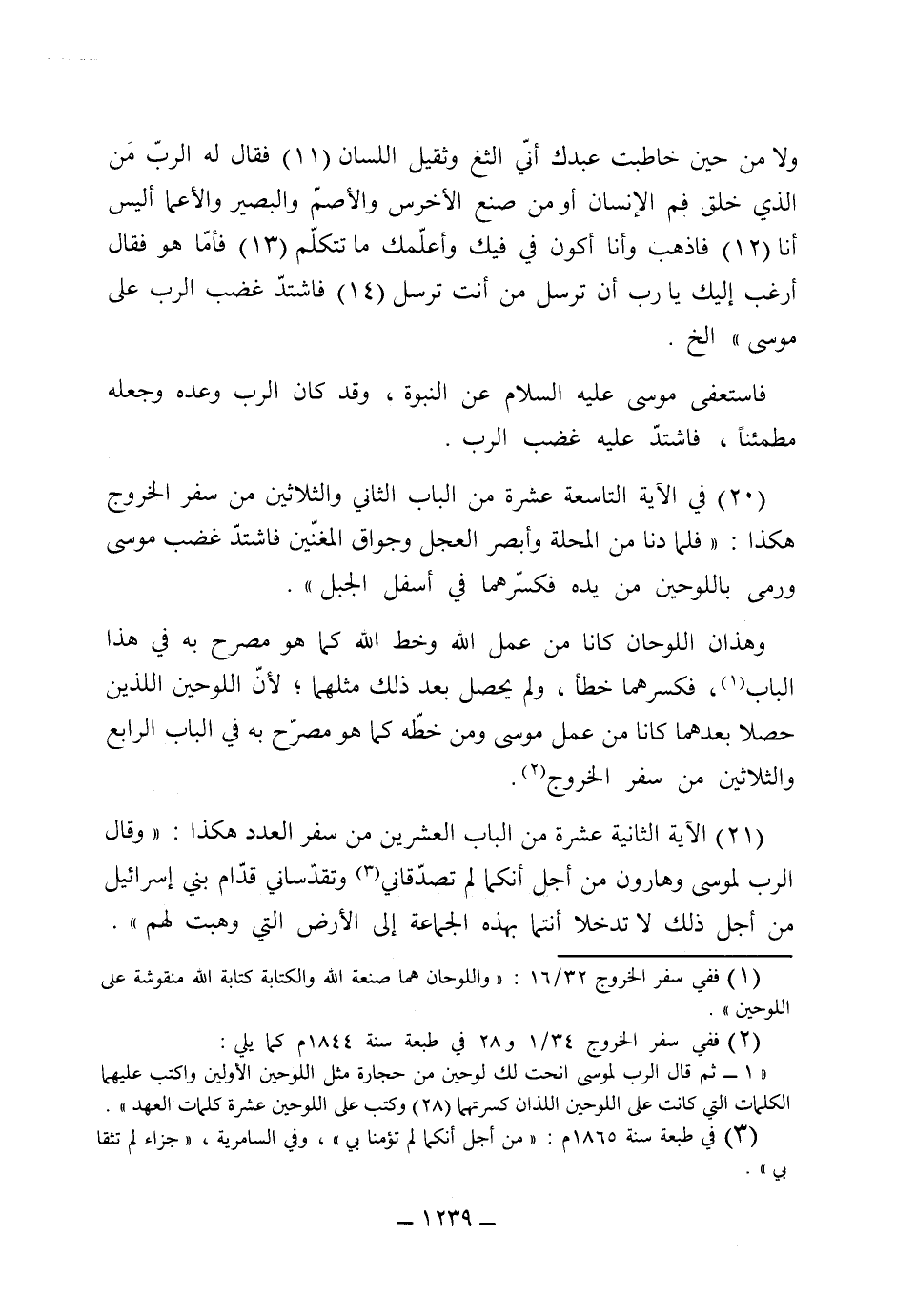 [20] في الآية التاسعة عشر من الباب الثاني والثلاثين من سفر الخروج هكذا: (فلما دنا من المحلة وأبصر العجل وجوق المغنيين فاشتد غضب موسى ورمى باللوحين من يده فكسرهما في أسفل الجبل) . وهذان اللوحان كانا من عمل الله وخط الله، كما هو مصرح به في هذا الباب، فكسرهما خطأ، ولم يحصل بعد ذلك مثلهما، لأن اللوحين اللذين حصلا بعدهما كانا من عمل موسى ومن خطه، كما هو مصرح به في الباب الرابع والثلاثين من سفر الخروج.