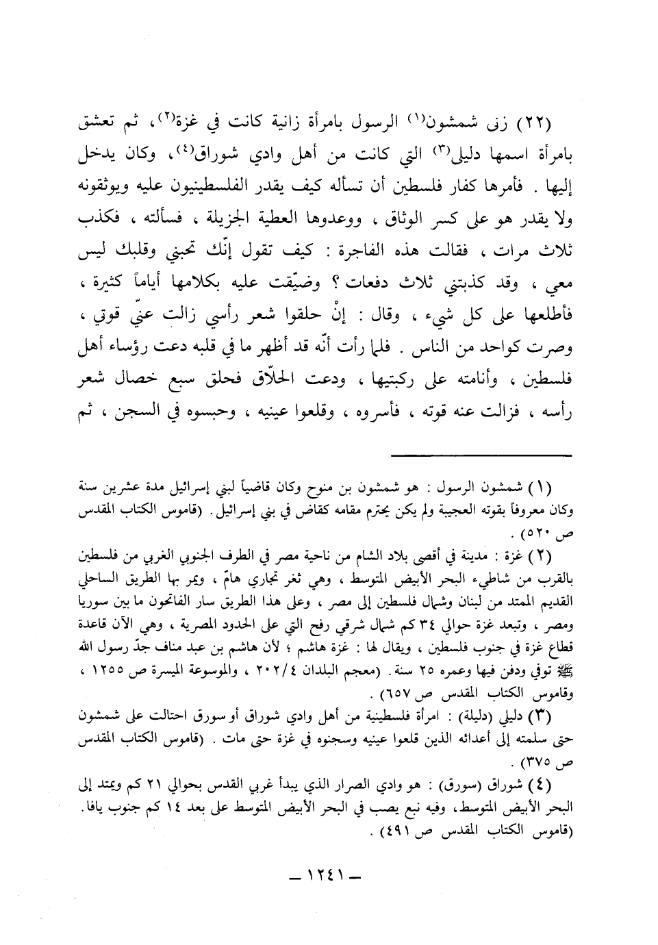 [22] زنى شمسون الرسول بامرأة زانية، كانت في غزة، ثم تعشق امرأة اسمها دليلي التي كانت من أهل وادي شوارق، وكان يدخل إليها، فأمرها كفار فلسطين أن تسأله، كيف يقدر الفلسطانيون عليه ويوثقونه، ولا يقدر هو على كثر الوثاق، ووعدوا العطية الجزيلة. فسألته فكذب ثلاث مرات، فقالت له هذه الفاجرة كيف تقول أنك تحبني وقلبك ليس معي وقد كذبتني ثلاث دفعات، وضيقت عليه بكلامها أياماً كثيرة فأطلعها على كل شيء، وقال: إن حلقوا شعر رأسي زالت عني قوتي وصرت كواحد من الناس. فلما رأت أنه قد أظهر ما في قلبه فدعت رؤساء أهل فلسطين، وأنامته على ركبتها، ودعت الحلاق فحلق سبع خصال شعر رأسه. فزالت عنه قوته، فأسروه وقلعوا عينيه وحبسوه في السجن، ثم