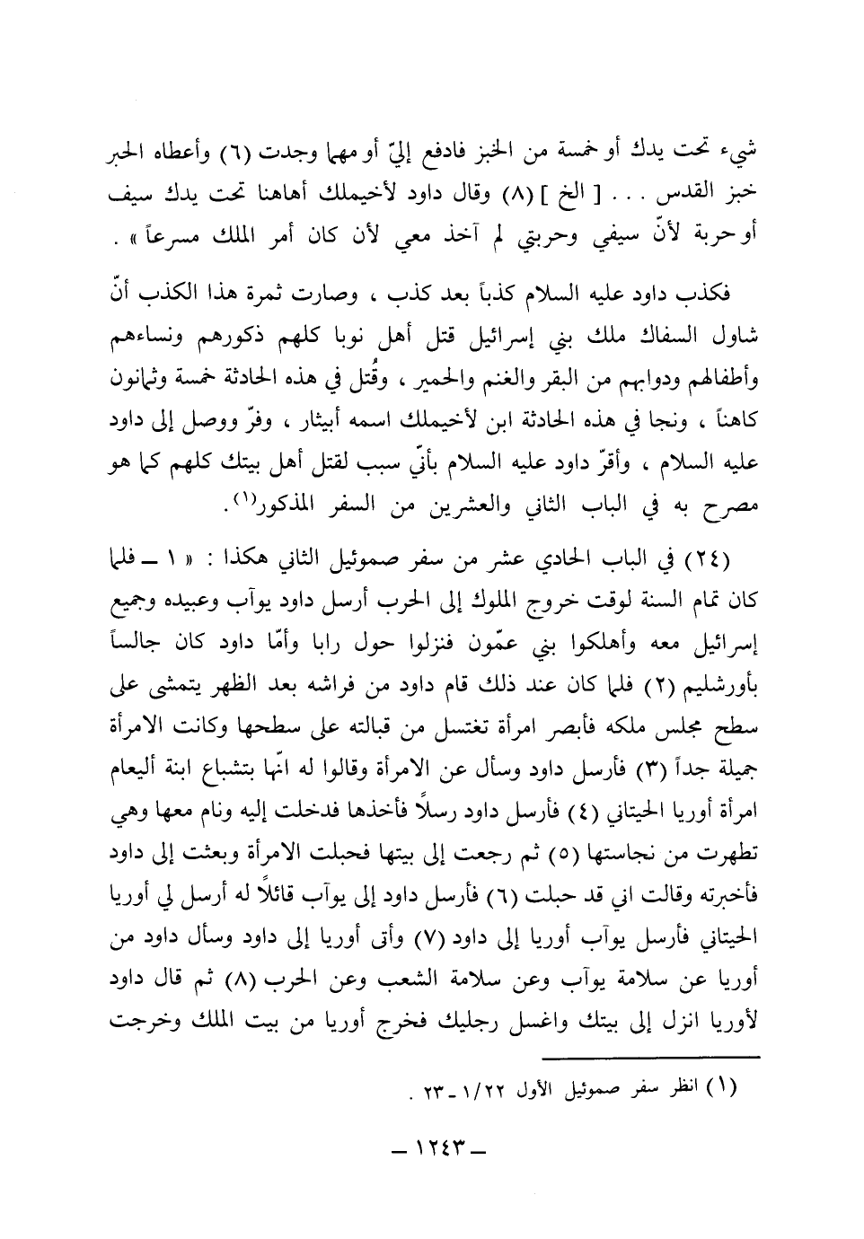 [24] في الباب الحادي عشر من سفر صموئيل الثاني هكذا: (قام داود عليه السلام من فراشه بعد الظهر يتمشى على سطح مجلس ملكه، فأبصر امرأة تغتسل على سطحها وكانت جميلة جداً، فأرسل داود عليه السلام وسأل عن الامرأة وقالوا له إنها بنت شباع امرأة أوريا، فأرسل داود رسلاً وأخذها ونام معها، ثم رجعت إلى بيتها فحبلت وأخبرته وقالت إني قد حبلت. فأرسل داود عليه السلام إلى يواب قائلاً له: أرسل إلى أوريا، فأرسل يواب أوريا، وسأل داود عليه السلام أوريا عن سلامة يواب وعن سلامة الشعب وعن الحرب، ثم قال: انزل إلى بيتك.