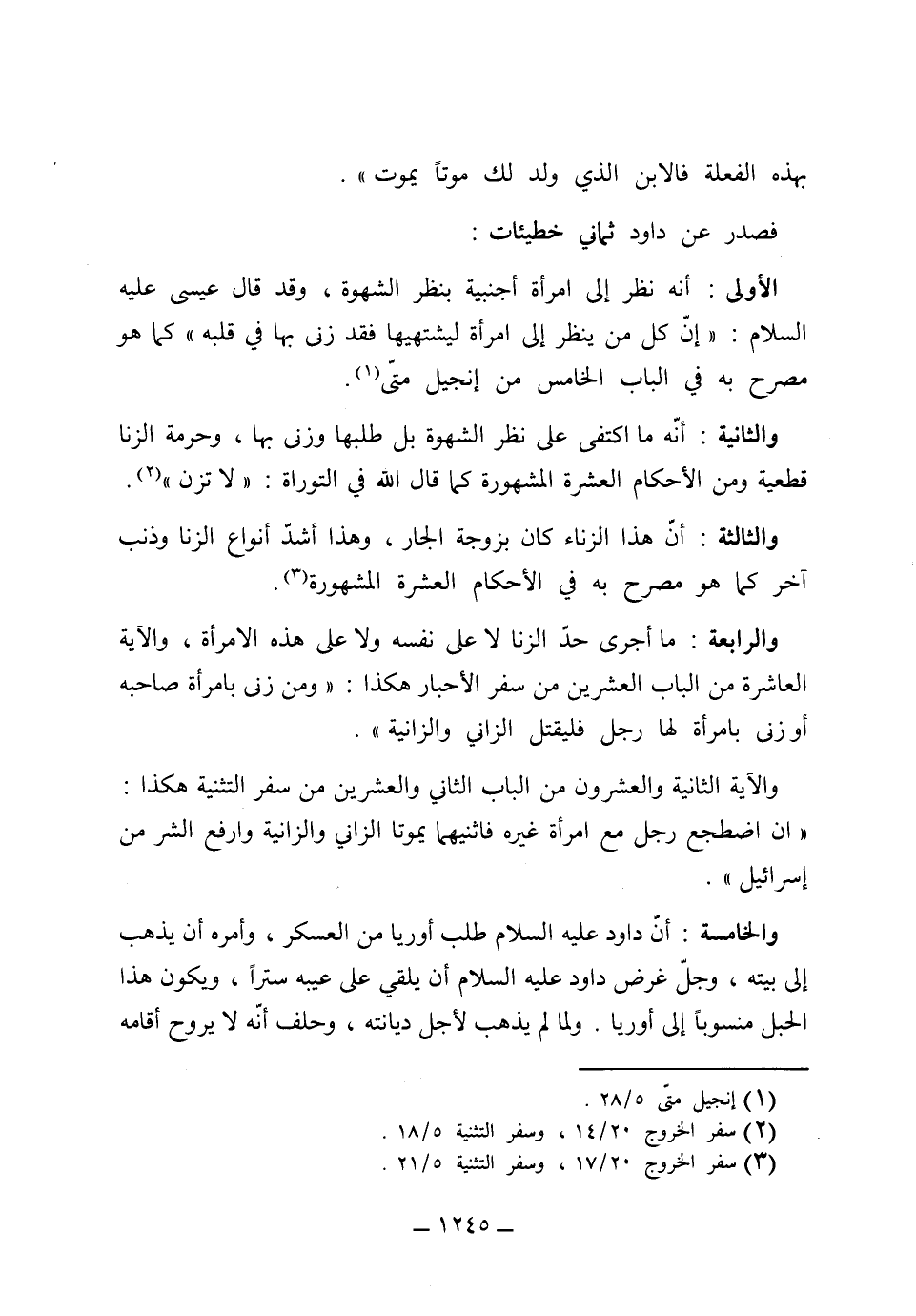 (الأولى) أنه نظر إلى امرأة أجنبية بنظر الشهوة، وقد قال عيسى عليه السلام أن كل من ينظر إلى امرأة ليشتهيها فقد زنى بها في قلبه، كما هو مصرح به في الباب الخامس من إنجيل متى.