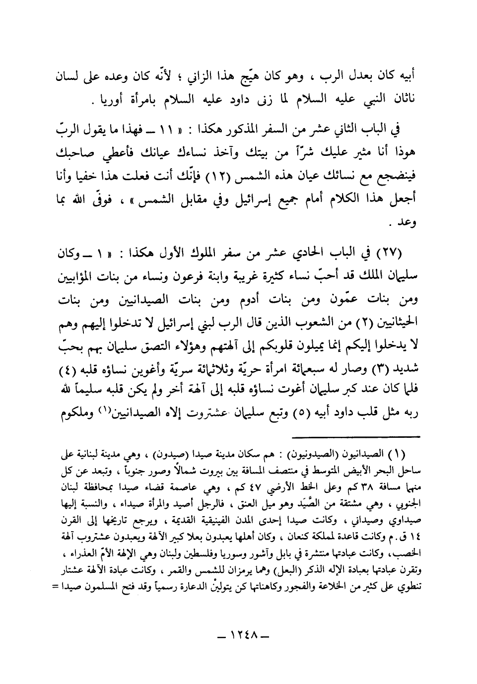 [27] في الباب الحادي عشر من سفر الملوك الأول هكذا: 1 (وكان سليمان الملك قد أحب نساء كثيرة غريبة، وابنة فرعون، ونساء من بنات الموابيين، ومن بنات عمون، ومن بنات أدوم، ومن بنات الصيدانيين، ومن بنات الحيثانيين) 2 (من الشعوب الذين قال الرب لبني إسرائيل لا تدخلوا إليهم، ولا يدخلوا إليكم لئلا يميلوا قلوبكم إلى آلهتكم، وهؤلاء التصق بهم سليمان بحب شديد) 3 (وصار له سبعمائة امرأة حرة، وثلثمائة سرية، وأغوت نساءه قلبه) 4 (فلما كان عند كبر سليمان أغوت نساءه إلى آلهة أخر، ولم يكن قلبه سليماً لله ربه مثل قلب داود أبيه) 5 (وتبع سليمان عستروت إله الصيدانيين وملكوم