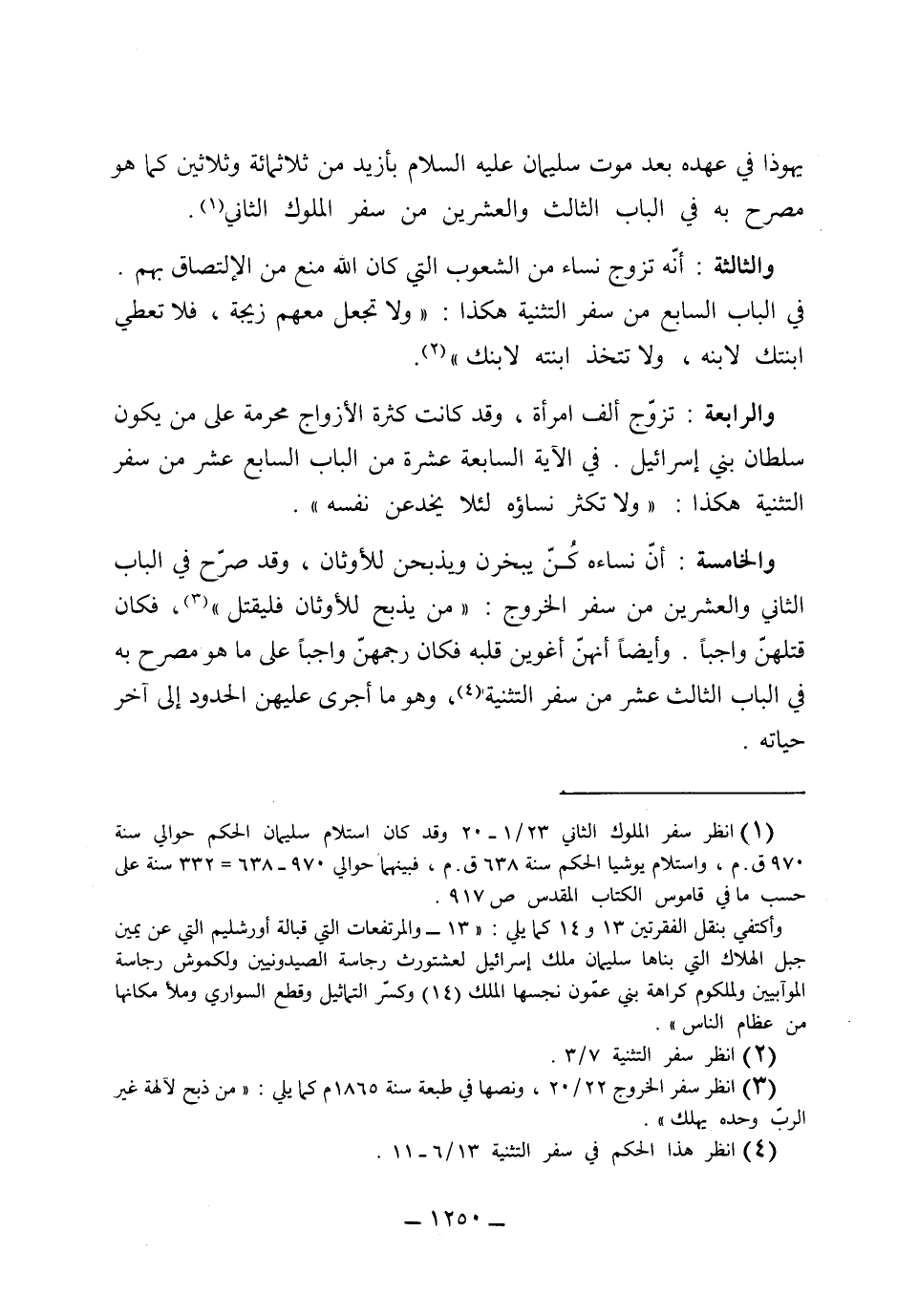 (والخامسة) أن نساءه كن يبخرن ويذبحن للأوثان، وقد صرح في الباب الثاني والعشرين من سفر الخروج: (من يذبح للأوثان فليقتل) . فكان قتلهن واجباً، وأيضاً أنهن أغوين قلبه، فكان رجمهن واجباً على ما هو مصرح به في الباب الثالث عشر من سفر الاستثناء، وهو ما أجرى عليهم الحدود إلى آخر حياته.