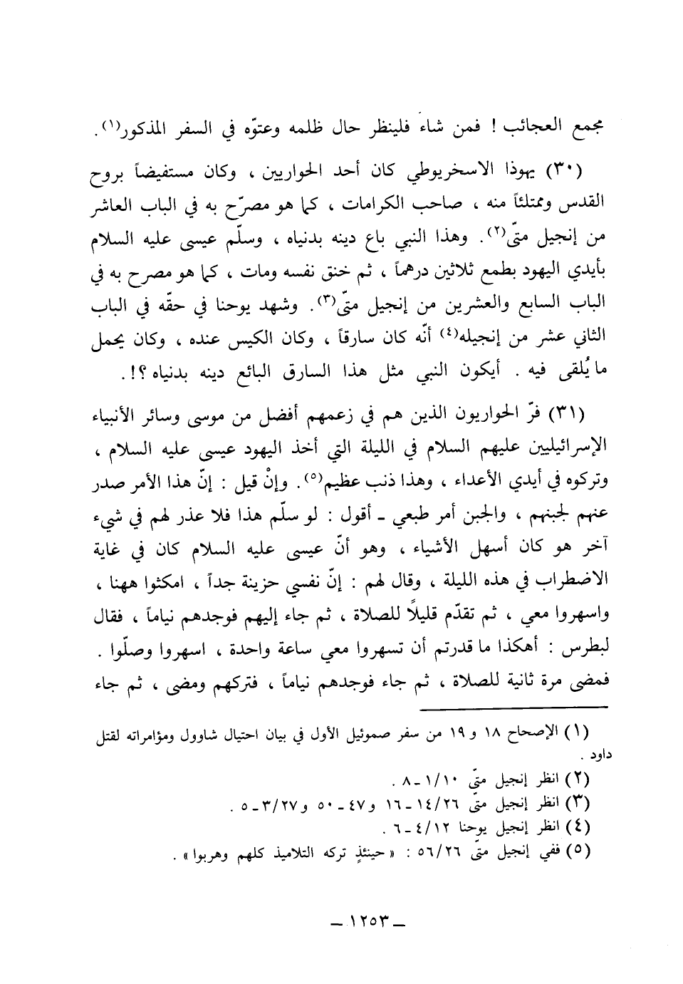 [30] يهوذا الأسخريوطي كان أحد الحواريين، وكان مستفيضاً بروح القدس، وممتلئاً عنة، صاحب الكرامات، كما هو مصرح به في الباب العاشر من إنجيل متى، وهذا النبي باع دينه بدنياه، وسلم عيسى عليه السلام بأيدي اليهود بطمع ثلاثين درهماً، ثم خنق نفسه ومات، كما هو مصرح به في الباب السابع والعشرين من إنجيل متى، وشهد يوحنا في حقه في الباب الثاني عشر من إنجيله أنه كان سارقاً، وكان الكيس عنده، وكان يحمل ما يلقى فيه. أيكون النبي مثل هذا السارق البائع دينه بدنياه.