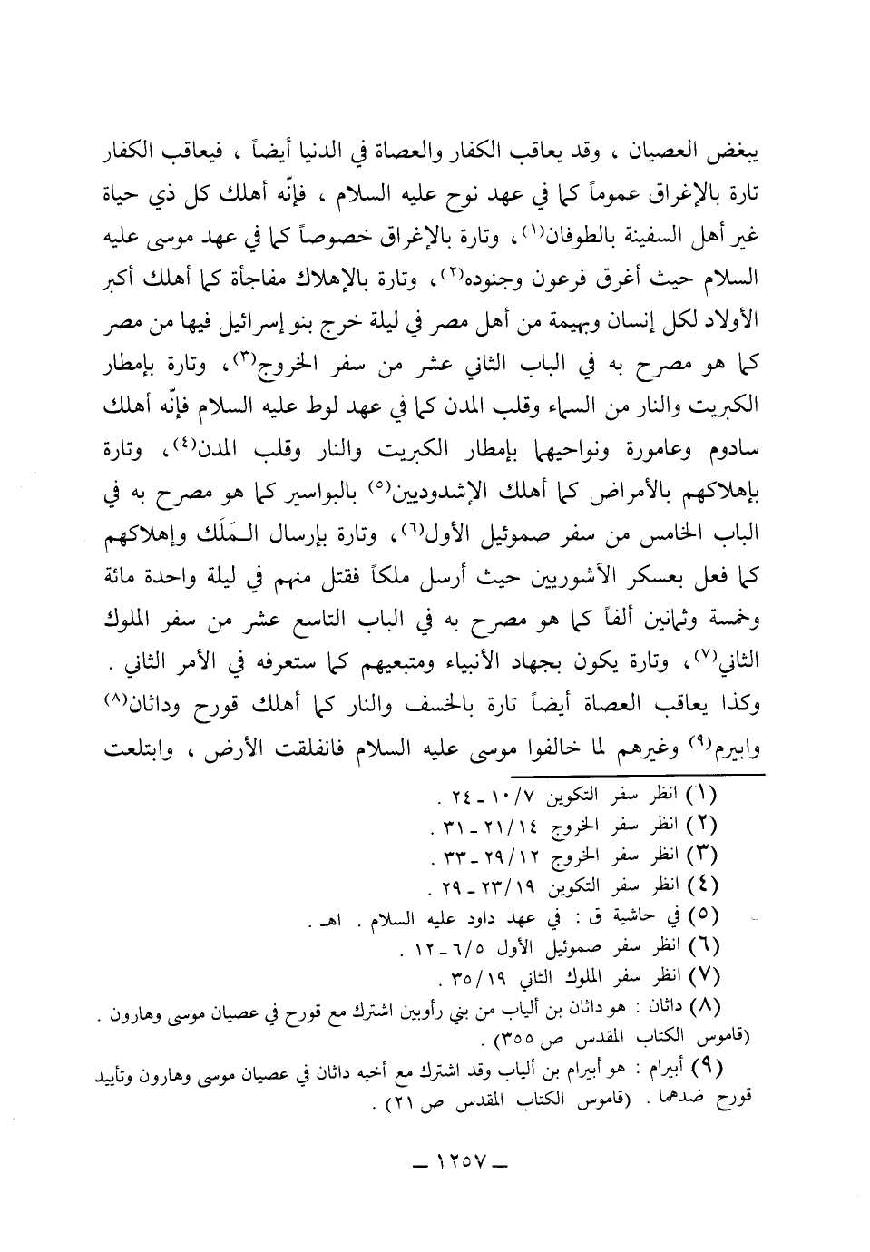 يبغض العصيان وقد يعاقب الكفار والعصاة في الدنيا أيضاً، فيعاقب الكفار تارة بالإغراق عموماً في عهد نوح عليه السلام، فإنه أهلك كل ذي حياة غير أهل السفينة بالطوفان، وتارة بالإغراق خصوصاً، كما في عهد موسى عليه السلام حيث أغرق فرعون وجنوده، وتارة بالإهلاك مفاجأة، كما أهلك أكبر الأولاد لكل إنسان وبهيمة من أهل مصر في ليلة خرج بنو إسرائيل فيها من مصر، كما هو مصرح به في الباب الثاني عشر من سفر الخروج، وتارة بإمطار الكبريت والنار من السماء، وقلب المدن، كما في عهد لوط عليه السلام، فإنه أهلك سادوم وعمورة ونواحيهما بإمطار الكبريت والنار وقلب المدن، وتارة بإهلاكهم بالأمراض، كما أهلك الأسدوديين بالبواسير، كما هو مصرح به في الباب الخامس من سفر صموئيل الأول، وتارة بإرسال الملك لإهلاكهم، كما فعل بعسكر الآثوريين، حيث أرسل ملكاً، فقتل منهم في ليلة واحدة مائة وخمسة وثمانين ألفاً، كما هو مصرح به في الباب التاسع عشر من سفر الملوك الثاني، وتارة بجهاد الأنبياء ومتبعيهم، كما ستعرف في الأمر الثاني، وكذا يعاقب العصاة أيضاً تارة بالخسف والنار، كما أهلك قورح وداثان وأبيرم وغيرهم لما خالفوا موسى عليه السلام، فانفلقت الأرض وابتلعت