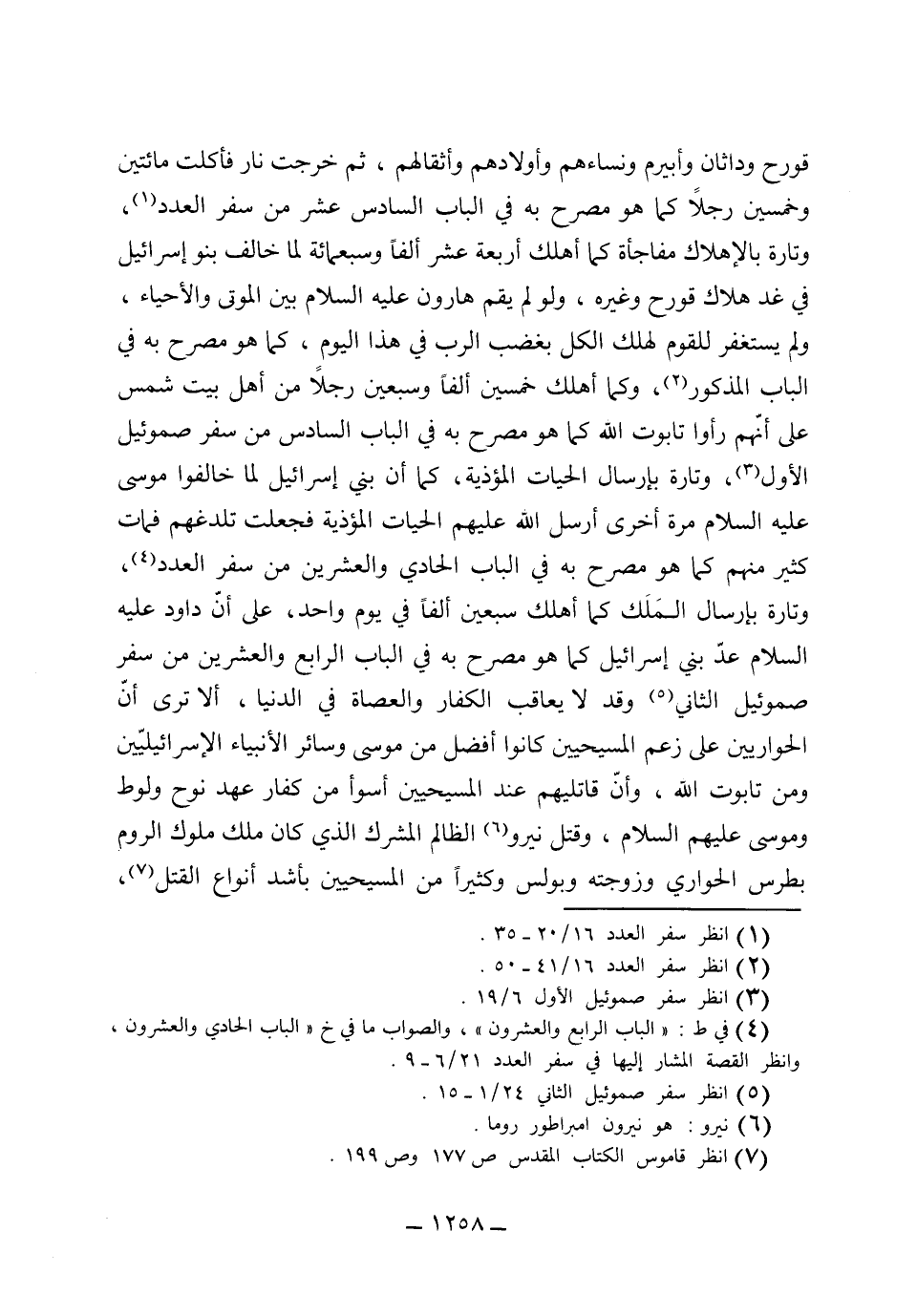 وتارة بالإهلاك مفاجأة كما أهلك أربعة عشر ألفاً وسبعمائة لما خالف بنو إسرائيل في غد هلاك قورح وغيره، ولو لم يقم هارون عليه السلام بين الموتى والأحياء، ولم يستغفر للقوم، لهلك الكل بغضب الرب في هذا اليوم، كما هو مصرح به في الباب المذكور. وكما أهلك خمسين ألفاً وسبعين رجلاً من أهل بيت الشمس على أنهم رأوا تابوت الله، كما هو مصرح به في الباب السادس من سفر صموئيل الأول. وتارة بإرسال الحيات المؤذية، كما أن بني إسرائيل لما خالفوا موسى عليه السلام مرة أخرى، أرسل الله عليهم الحيات المؤذية، فجعلت تلدغهم، فمات كثير منهم كما هو مصرح به في الباب الرابع والعشرين من سفر العدد. وتارة بإرسال الملك كما أهلك سبعين ألفاً في يوم واحد، على أن داود عليه السلام عد بني إسرائيل، كما هو مصرح به في الباب الرابع والعشرين من سفر صموئيل الثاني. وقد لا يعاقب الكفار والعصاة في الدنيا. ألا ترى أن الحواريين على زعم المسيحيين كانوا أفضل من موسى وسائر الأنبياء الإسرائيلية، ومن تابوت الله. وأن قاتليهم عند المسيحيين أسوأ من كفار عهد نوح ولوط وموسى عليهم السلام. وقتل نيرو الظالم المشرك، الذي كان ملك ملوك الروم، بطرس الحواري وزوجته وبولس وكثيراً من المسيحيين بأشد أنواع القتل.