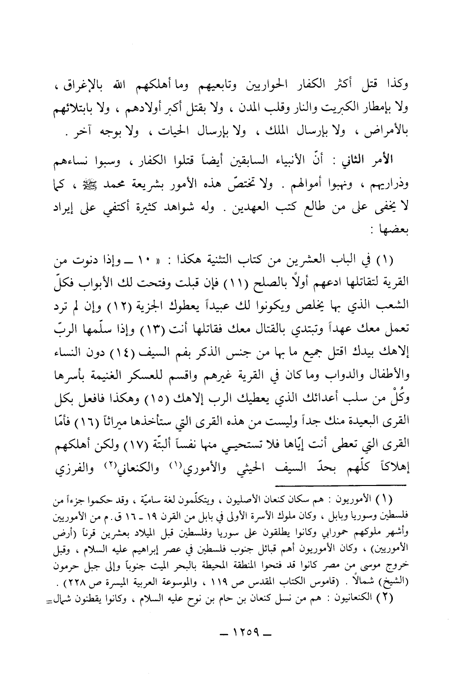 1- في الباب العشرين من كتاب الاستثناء هكذا: 10 (وإذا دنوت من قرية لتقاتلها ادعهم أولاً إلى الصلح) 11 (فإذا قبلت وفتحت لك الأبواب فكل الشعب الذي بها يخلص ويكونون لك عبيداً يعطونك الجزية) 12 (وإن لم ترد تعمل معك عهداً وتبتدئ بالقتال معك فقاتلها أنت) 13 (وإذا سلمها الرب إلهك بيدك اقتل جميع من بها من جنس الذكر بفم السيف) 14 (دون النساء والأطفال والدواب وما كان في القرية غيرهم، واقسم للعسكر الغنيمة بأسرها وكل من سلب أعدائك الذي يعطيك الرب إلهك) 15 (وهكذا فافعل بكل القرى البعيدة منك جداً وليست من هذه القرى التي ستأخذها ميراثاً) 16 (فأما القرى التي تعطى أنت إياها فلا تستحي منها نفساً البتة) 17 (ولكن أهلكهم إهلاكاً كلهم بحد السيف الحيثي والأموري والكنعاني والفرزي