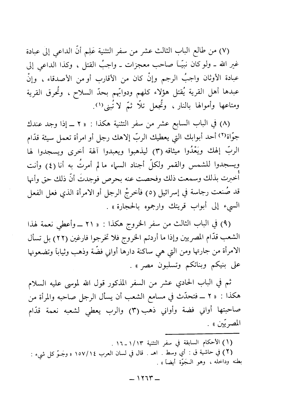 7- من طالع الباب الثالث عشر من سفر الاستثناء، علم أن الداعي إلى عبادة غير الله، ولو كان نبياً صاحب معجزات، واجب القتل، وكذا الداعي إلى عبادة الأوثان واجب الرجم، وإن كان من الأقارب أو من الأصدقاء. وإن عبدها أهل القرية، يقتل هؤلاء كلهم ودوابهم بحد السلاح وتحرق القرية ومتاعها وأموالها بالنار وتجعل تلاً، ثم لا تبنى.