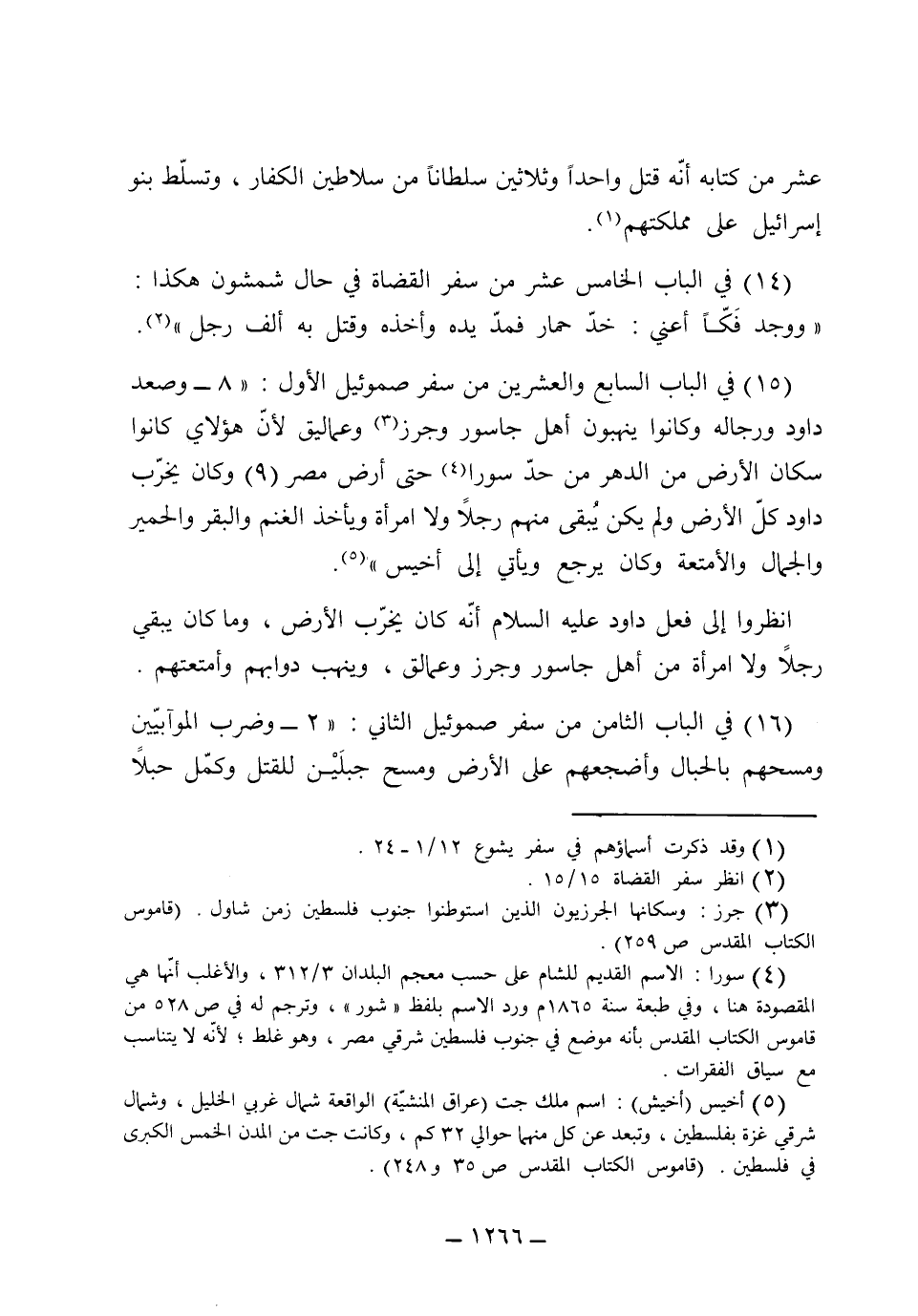 15 - في الباب السابع والعشرين من سفر صموئيل الأول: 8 (وصعد داود ورجاله، وكانوا ينهبون أهل جاسور وجرز وعمالق، لأن هؤلاء كانوا سكان الأرض من الدهر من حد سوراً حتى حد مصر) 9 (وكان يخرب داود كل الأرض، ولم يكن يبقى منهم رجلاً، ولا امرأة، ويأخذ الغنم، والبقر، والحمير، والجمال، والأمتعة، وكان يرجع ويأتي إلى أخيس) . انظروا إلى فعل داود عليه السلام أنه كان يخرب الأرض، وما كان يبقي رجلاً، ولا امرأة من أهل جاسور، وجرز، وعمالق، وينهب دوابهم وأمتعتهم.