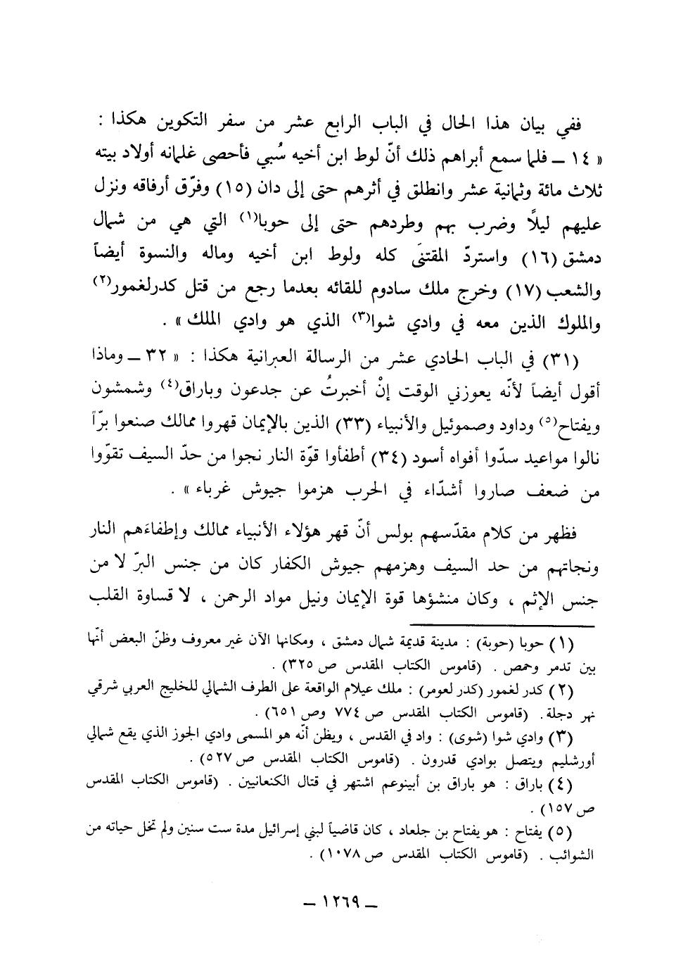 ففي بيان هذا الحال في الباب الرابع عشر من سفر التكوين هكذا: 14 (فلما سمع إبرام أن لوطاً ابن أخيه سبي فأحصى غلمانه أولاد بيته ثلثمائة وثمانية عشر، وانطلق في أثرهم حتى أتى دان) 15 (وفرق أرفاقه، ونزل عليهم ليلاً، وضربهم، وطردهم إلى حوبا التي هي من شمال دمشق) 16 (واسترد المقتنى كله، ولوطاً ابن أخيه وماله، والنسوة أيضاً، والشعب) 17 (وخرج ملك سادوم للقائه بعد ما رجع من قتل كدرلغمور، والملوك الذين معه في وداي شوا الذي هو وادي الملك) .