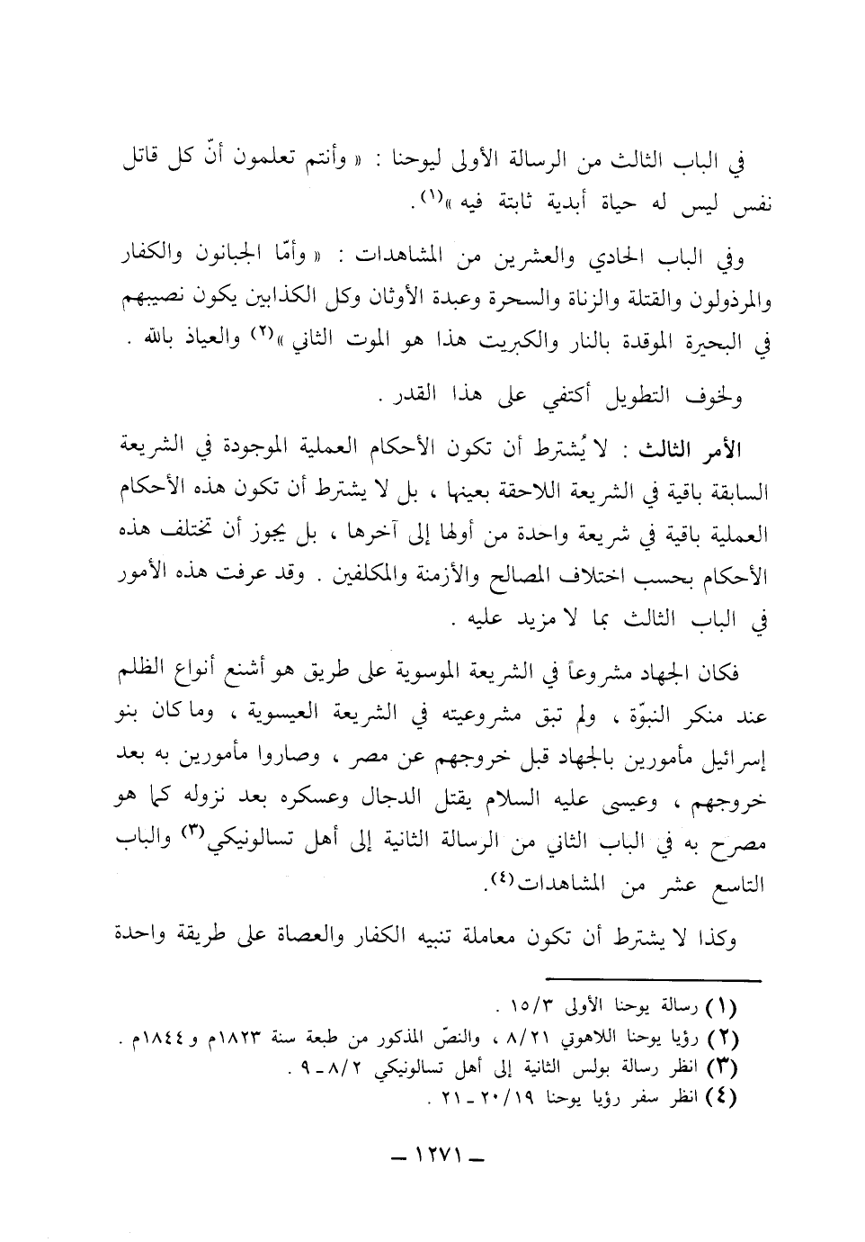 في الباب الثالث من الرسالة الأولى ليوحنا: (وأنتم تعلمون أن كل قاتل نفس ليس له حياة أبدية ثابتة فيه) . وفي الباب الحادي والعشرين من المشاهدات: (وأما الجبانون والكفار والمرذولون والقتلة والزناة والسحرة وعبدة الأوثان، وكل الكذابين يكون نصيبهم في البحيرة الموقدة بالنار والكبريت) . هذا هو الأمر الثاني والعياذ بالله، وحذراً من التطويل أكتفي على هذا القدر.