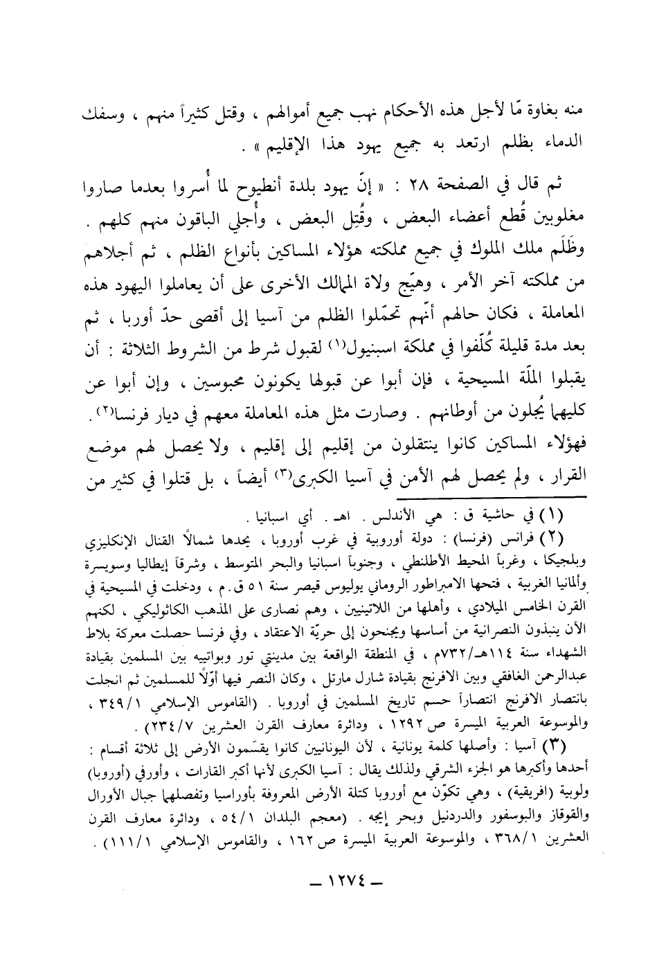 ثم قال في الصفحة 28: (أن يهود البلد انطيوح لما أسروا بعد ما صاروا مغلوبين، قطع أعضاء البعض، وقتل البعض، وأجلى الباقين منهم كلهم، وظلم ملك الملوك في جميع مملكته هؤلاء المشاركين بأنواع الظلم، ثم أجلاهم من مملكته آخر الأمر. وهيج ولاة الممالك الأخرى على أن يعاملوا اليهود هذه المعاملة، فكان حالهم أنهم تحملوا الظلم من آسيا إلى أقصى حد أوربا، ثم بعد مدة قليلة كلفوا في مملكة اسبنيول لقبول شرط من الشروط الثلاثة: أن يقبلوا الملة المسيحية فإن أبوا عن قبولها يكونون محبوسين، وإن أبوا عن كليهما يجلون من أوطانهم، وصار مثل هذه المعاملة معهم في ديار فرانس. فهؤلاء المساكين كانوا ينتقلون من إقليم إلى إقليم ولا يحصل لهم موضع القرار، ولم يحصل لهم الأمن في آسيا الكبير أيضاً بل قتلوا في كثير من