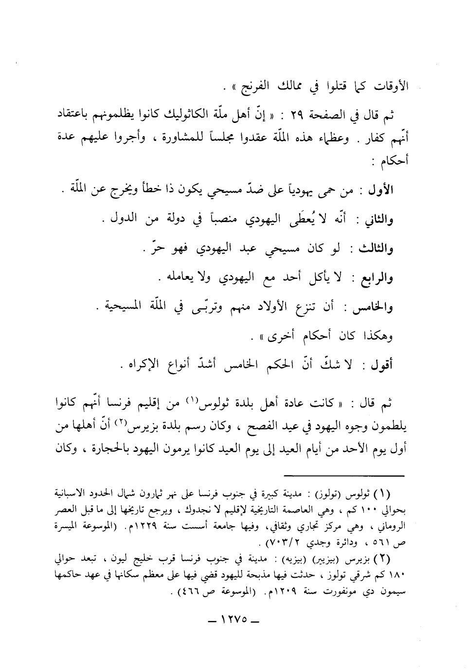ثم قال في الصفحة 29: (أن أهل ملة كتلك كانوا يظلمونهم باعتقاد أنهم كفار وعظماء هذه الملة عقدوا مجلساً للمشورة، وأجروا عليهم عدة أحكام: (الأول) : من حمى يهودياً على ضد مسيحي يكون ذا خطأ، ويخرج عن الملة. (والثاني) : أنه لا يعطى يهودي منصباً في دولة من الدول. (والثالث) : لو كان مسيحي عبد يهودي فهو حر. (والرابع) : لا يأكل أحد مع اليهودي، ولا يعامله. (والخامس) : أن ينزع الأولاد منهم وتربى في الملة المسيحية، وهكذا كان أحكام أخر) . أقول لا شك أن الحكم الخامس أشد أنواع الإكراه. ثم قال: (كانت عادة أهل البلدة ثولوس من إقليم فرانس أنهم كانوا يلطمون وجوه اليهود في عيد الفصح، وكان رسم البلدة بزيرس أن أهلها من أول يوم الأحد من أيام العيد إلى يوم العيد، كانوا يرمون اليهود بالحجارة، وكان