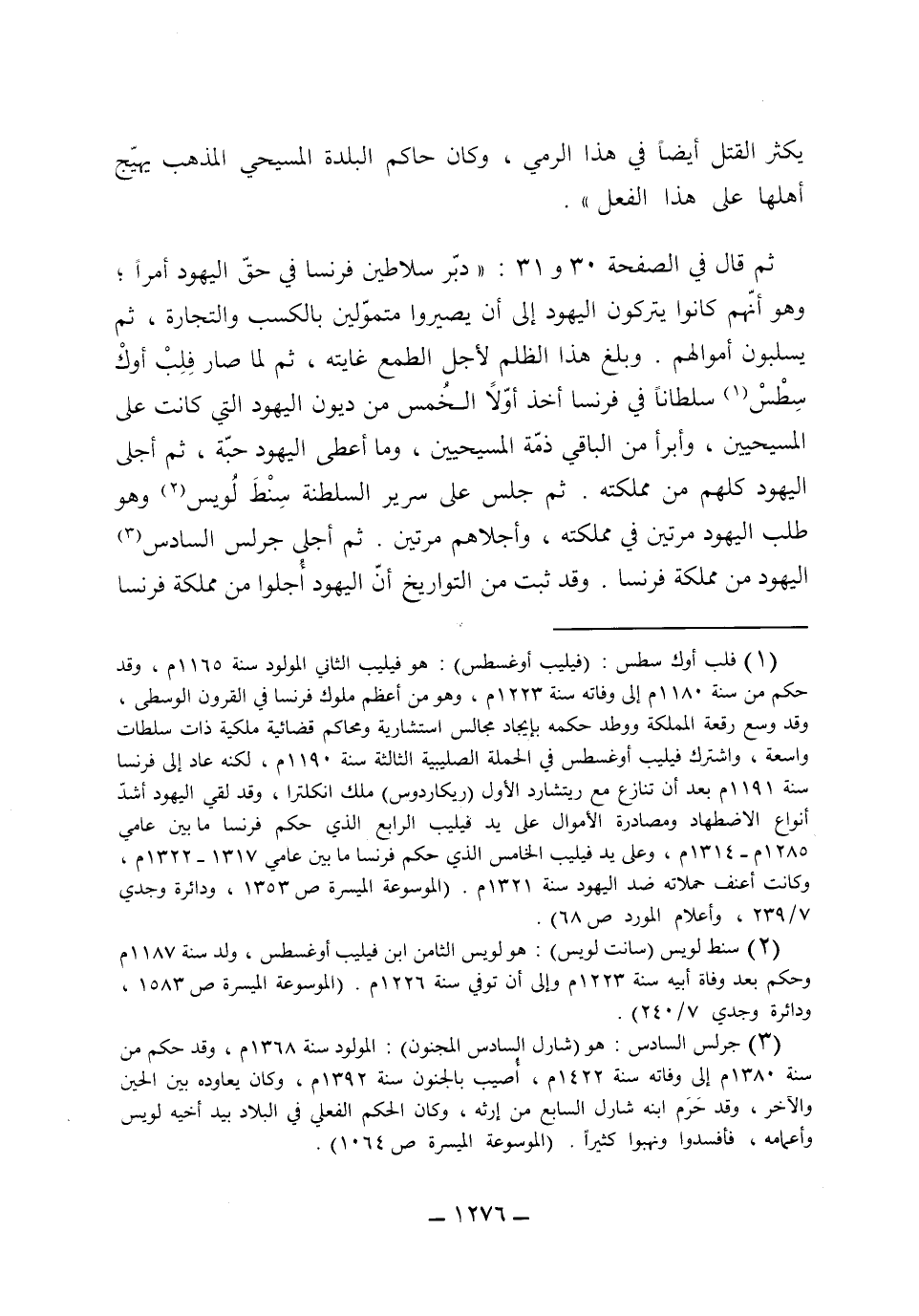 ثم قال في الصفحة 30 و 31: (دبر سلاطين فرانس في حق اليهود أمراً، وهو أنهم كانوا يتركون اليهود إلى أن يصيروا متمولين بالكسب والتجارة، ثم يسلبون أموالهم، وبلغ هذا الظلم لأجل الطمع غايته، ثم لما صار فلب أوك سطس سلطاناً في فرانس، أخذ أولاً الخمس من ديون اليهود التي كانت على المسيحيين، وأبرأ من الباقي ذمة المسيحيين، وما أعطى اليهود حبة، ثم أجلى اليهود كلهم من مملكته، ثم جلس على سرير السلطنة سنط لوئيس وهو يطلب اليهود مرتين في مملكته وأجلاهم مرتين، ثم أجلى جرلس السادس اليهود من مملكة فرانس، وقد ثبت من التواريخ، أن اليهود أجلوا من مملكة فرانسا