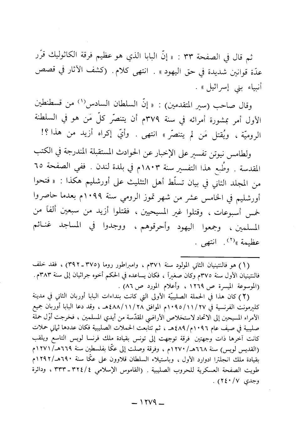 ثم قال في الصفحة 33: (أن البابا الذي هو عظيم فرقة كاتلك قرر عدة قوانين شديدة في حق اليهود) . انتهى كلام كشف الآثار في قصص أنبياء بني إسرائيل.