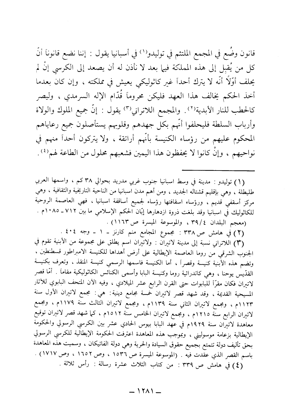 قانون وضع في المجمع الملتم في توليد وفي سبانيا يقول أننا نضع قانوناً: أن كل من يقبل إلى هذه المملكة فيما بعد، لا تأذن له أن يصعد إلى الكرسي إن لم يحلف أولاً أنه لا يترك أحداً غير كاثوليكي يعيش في مملكته، وإن كان بعد ما أخذ الحكم يخالف هذا العهد فليكن محروماً، فدام الإله السرمدي وليصر كالحطب للنار الأبدية) . مجموع المجامع من كارتراوجه 404 (والمجمع اللاتراني يقول أن جميع الملوك والولاة وأرباب السلطنة فليحلفوا أنهم بكل جهدهم وقلوبهم يستأصلون جميع رعاياهم المحكوم عليهم من رؤساء الكنيسة بأنهم أراتقة، ولا يتركون أحداً منهم في نواحيهم، وأن كانوا لا يحفظون هذه اليمين فشعبهم محلول من الطاعة لهم) .