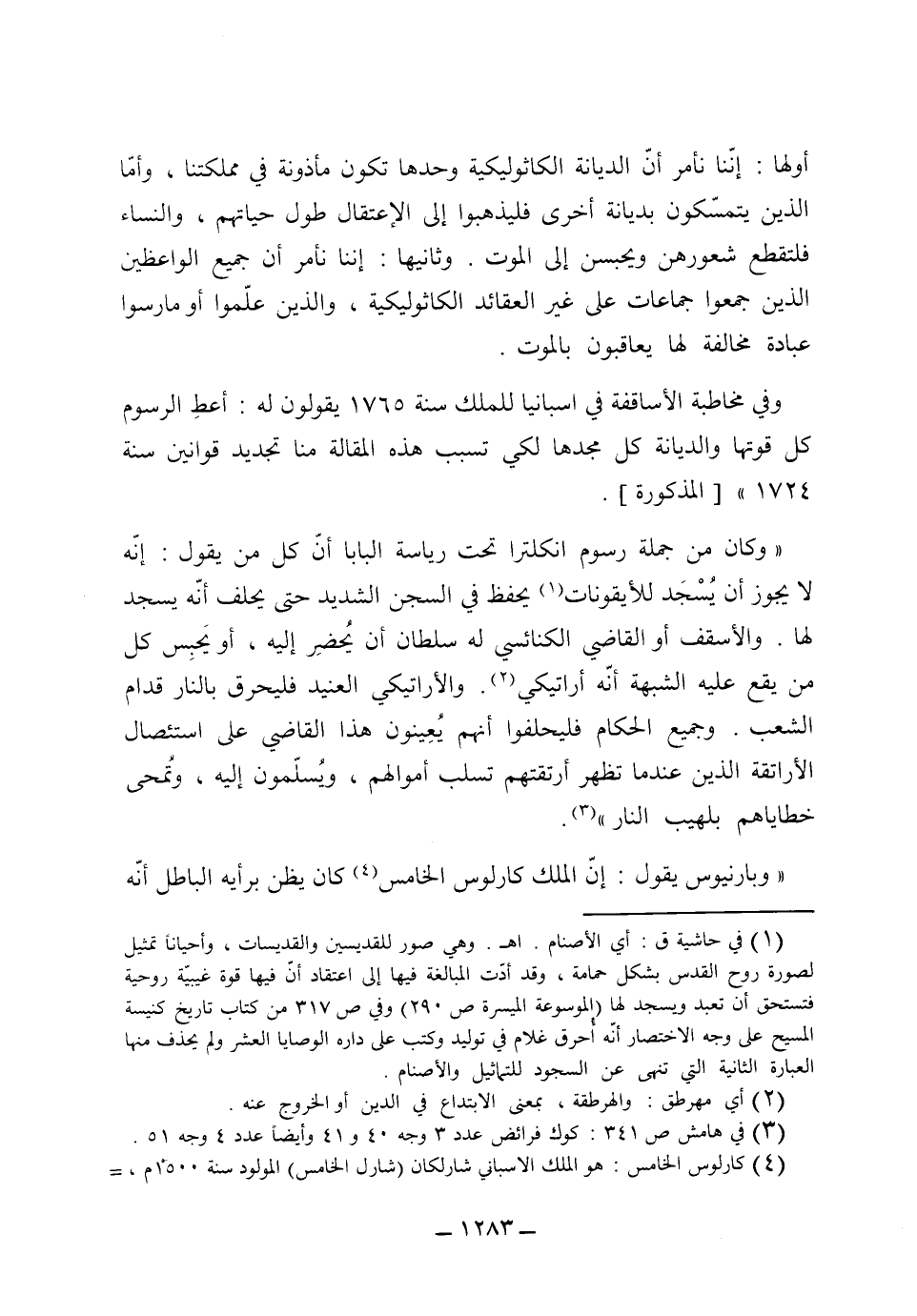 وثانيها: أننا نأمر أن جميع الواعظين الذي جمعوا جماعات على غير العقائد الكاتوليكية، والذين علموا أو مارسوا عبادة مخالفة لها يعاقبون بالموت. وفي مخاطبة الأساقفة في سبانيا للملك سنة 1765 يقولون له أعط الرسوم كل قوتها، والديانة كل مجدها، لكن تسبب هذه المقالة منا تجديد قوانين سنة 1724 المذكورة: (وكان من جملة رسوم إنكلترا تحت رياسة البابا أن كل من يقول أنه لا يجوز أن يسجد للايفونات يحبس في السجن الشديد حتى يحلف أنه يسجد لها، والأسقف أو القاضي الكنايسي له سلطان أن يحضر إليه، أو يحبس كل من يقع عليه الشبهة أنه أراتيكي، والأراتيكي العنيد فليحرق بالنار قدام الشعب، وجميع الحكام فليحلفوا أنهم يعينون هذا القاضي على استئصال الأراتقة الذين عندما تظهر أرتقتهم تسلب أموالهم ويسلمون إليه، وتمحى خطاياهم بلهيب النار) . كوك فرائض عدد 3 وجه 40 و 41 وأيضاً عدد 4 وجه 15 (وبارونيوس يقول أن الملك كارلوس الخامس، كان يظن برأيه الباطل، أنه