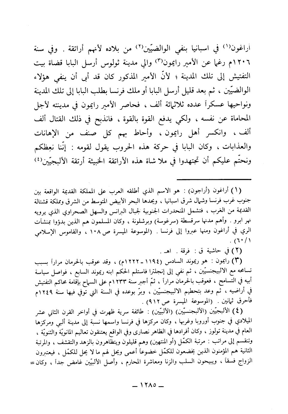 اراغون في إسبانيا بنفي الواضيين من بلاده، لأنهم أراتقة.. وفي سنة 1206 رغماً عن الأمير رايمون وإلى مدينة ثولوس، أرسل البابا قضاة بيت التفتيش إلى تلك المدينة، لأن الأمير المذكور كان قد أبى أن ينفي هؤلاء الواضيين، ثم بعد قليل أرسل ملك فرنسا بطلب البابا إلى تلك المدينة ونواحيها عسكراً، عدده ثلثمائة ألف، فحاصر الأمير رايمون في مدينته لأجل المحاماة عن نفسه، ولكي يدفع القوة بالقوة، فانذبح في ذلك القتال ألف ألف، وانكسر أهل رايمون وأحاط بهم كل صنف من الإهانات والعذابات، وكان البابا في حركة هذه الحروب يقول لقومه: إننا نعظمكم ونحتم عليكم أن تجتهدوا في ملاشاة هذه الأرتقة الخبيثة أرتقة الألبجيين