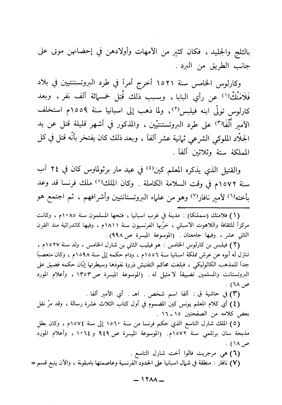 بالثلج. والجليد، فكان كثير من الأمهات وأولادهن في أحضانهن موتى على جانب الطريق من البرد.. وكارلوس الخامس سنة 1521، أخرج أمراً في طرد البروتستنتيين في بلاد فلامنك عن رأي البابا، وبسبب ذلك قتل خمسمائة ألف نفر..