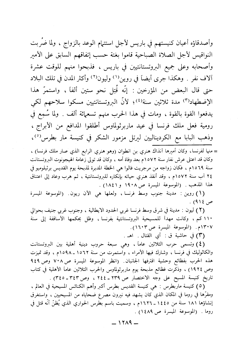 وأصدقاء أعيان كنيستهم في باريس لأجل استتمام الوعد بالزواج، ولما ضربت النواقيس لأجل الصلاة الصباحية، قاموا بغتة حسب اتفاقهم السابق على الأمير وأصحابه، وعلى جميع البروتستنتيين في باريس، فذبحوا منهم للوقت عشرة آلاف نفر، وهكذا جرى أيضاً في روين وليون وأكثر المدن في تلك البلاد، حتى قال البعض من المؤرخين أنه قتل نحو ستين ألفاً، واستمر هذا الاضطهاد مدة ثلاثين سنة، لأن البروتستنتيين مسكوا سلاحهم لكي يدفعوا القوة بالقوة، ومات في هذا الحرب منهم تسعمائة ألف، ولما سمع في رومية فعل ملك فرنسا في عيد ماربرثولماوس أطلقوا المدافع من الأبراج، وذهب البابا مع الكرديناليين ليرتل مزمور الشكر في كنيسة ماربطرس،