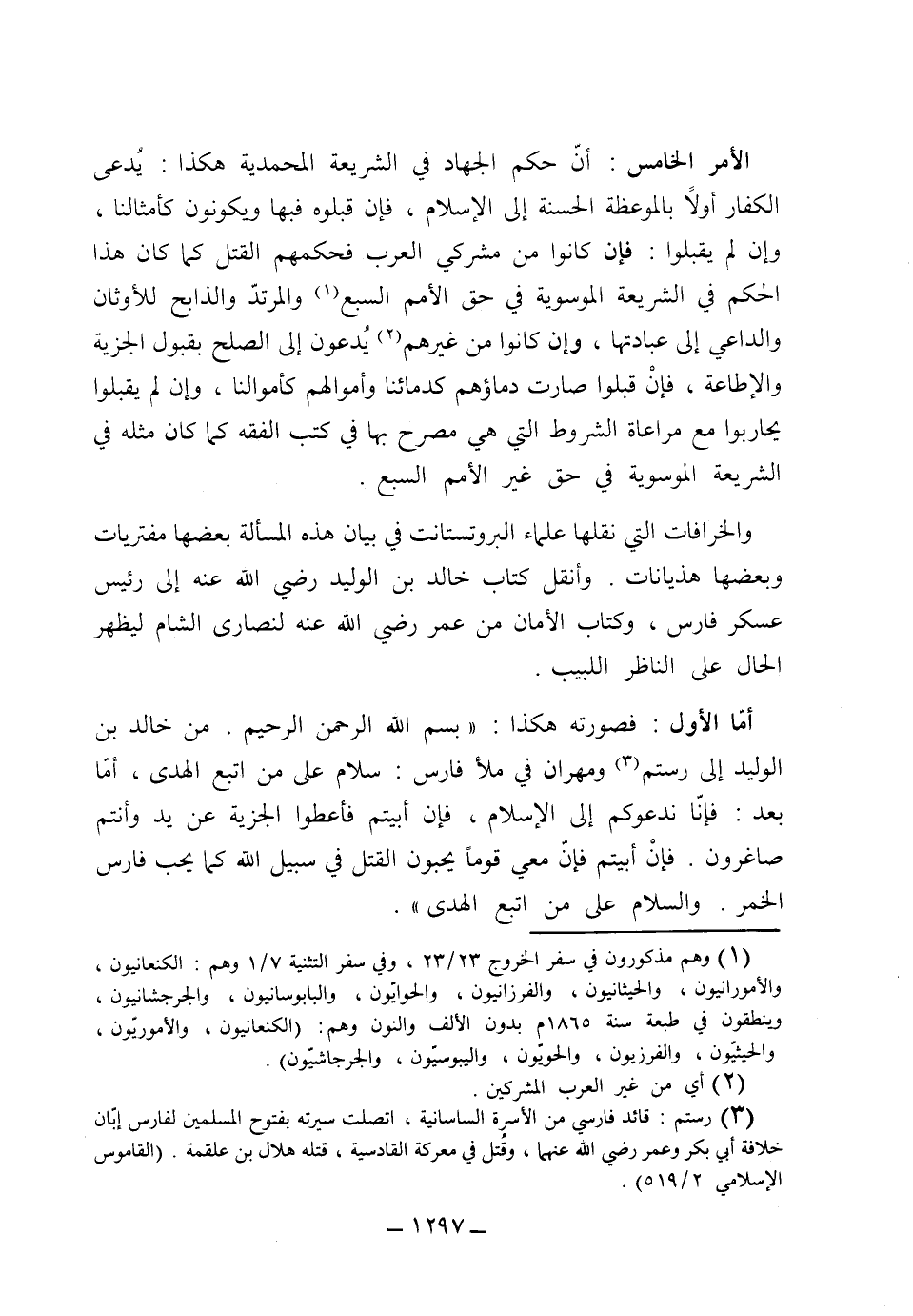وأنقل كتاب خالد بن الوليد رضي الله عنه إلى رئيس عسكر فارس وكتاب الأمان من عمر رضي الله عنه لنصارى الشام ليظهر الحال على الناظر اللبيب.