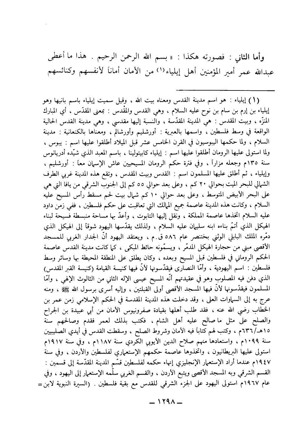 وأما الثاني فصورته هكذا: (بسم الله الرحمن الرحيم هذا ما أعطى عبد الله عمر أمير المؤمنين أهل إيلياء من الأمان أماناً لأنفسهم وكنائسهم