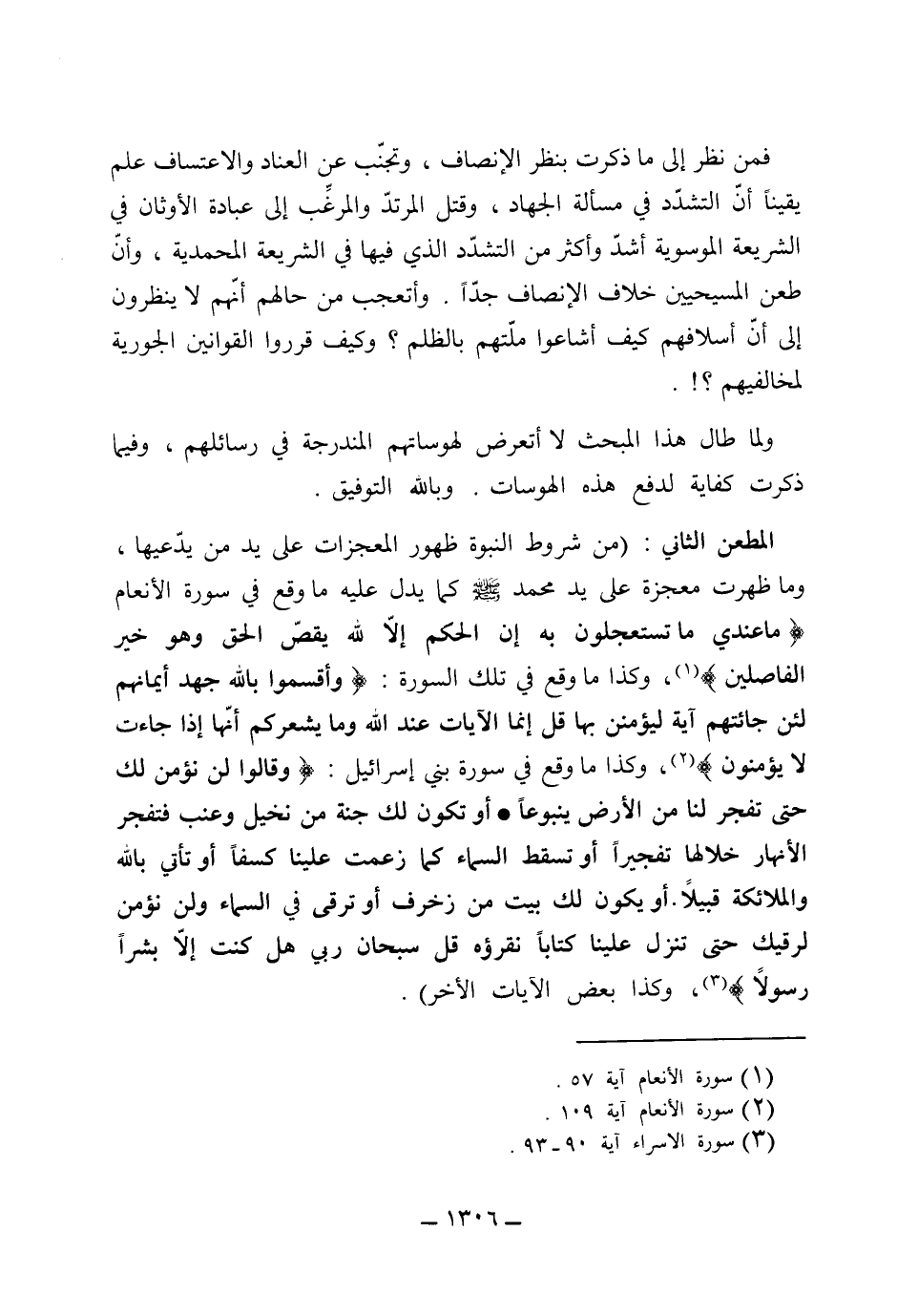 فمن نظر إلى ما ذكرت بنظر الإنصاف، وتجنب عن العناد والاعتساف، علم يقيناً أن التشدد في مسألة الجهاد، وقتل المرتد والمرغب إلى عبادة الأوثان في الشريعة الموسوية، أشد وأكثر من التشدد الذي فيها في الشريعة المحمدية، وأن طعن المسيحيين خلاف الإنصاف جداً، وأتعجب من حالهم أنهم لا ينظرون إلى أن أسلافهم كيف أشاعوا ملتهم بالظلم وكيف قرروا القوانين الجورية لمخالفيهم. ولما طال هذا البحث لا أتعرض لهوساتهم المندرجة في رسائلهم. وفيما ذكرت كفاية لذفع هذه الهوسات وبالله التوفيق.