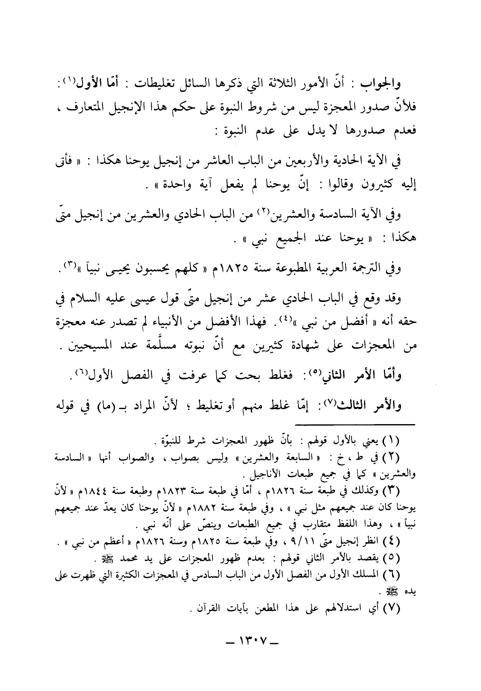 أما الأول: فلأن صدور المعجزة ليس من شروط النبوة على حكم هذا الإنجيل المتعارف، فعدم صدورها لا يدل على عدم النبوة.. في الآية الحادية والأربعين من الباب العاشر من إنجيل يوحنا هكذا: (فأتى إليه كثيرون، وقالوا إن يوحنا لم يفعل آية واحدة) .. وفي الآية السابعة والعشرين من الباب الحادي والعشرين من إنجيل متى هكذا: (يوحنا عند الجميع نبي) .. وفي الترجمة العربية المطبوعة سنة 1835 (كلهم يحسبون يحيى نبياً) . وقد وقع في الباب الحادي عشر من إنجيل متى قول عيسى عليه السلام في حقه: (إنه أفضل من نبي) . فهذا الأفضل من الأنبياء لم تصدر عنه معجزة من المعجزات على شهادة كثيرين مع أن نبوته مسلمة عند المسيحيين.