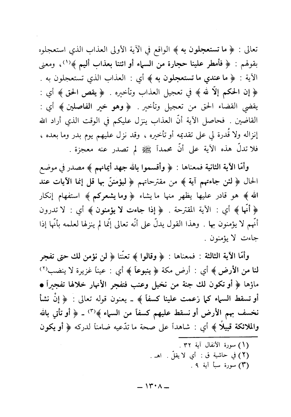 وأما الآية الثالثة فمعناها {وقالوا لن نؤمن لك حتى تفجر لنا من الأرض} أي أرض مكة {ينبوعاً} أي عيناً غزيرة لا ينضب ماؤها {أو تكون لك جنة من نخيل وعنب، فتفجر الأنهار خلالها تفجيراً أو تسقط السماء كما زعمت علينا كسفاً} يعنون قوله تعالى: {إن نشأ نخسف بهم الأرض أو نسقط عليهم كسفاً من السماء} ، {أو تأتي بالله والملائكة قبيلاً} أي شاهداً على صحة ما تدعيه ضامناً لدركه {أو يكون