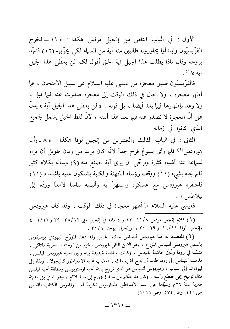 (الأول) في الباب الثامن من إنجيل مرقس هكذا: 11 (فخرج الفريسيون وابتدؤوا يحاورونه طالبين منه آية من السماء لكي يجربوه) 12 (فتنهد بروحه وقال لماذا يطلب هذا الجيل آية الحق، أقول لكم لن يعطى هذا الجيل آية، فالفريسيون طلبوا معجزة من عيسى عليه السلام على سبيل الامتحان، فما أظهر معجزة، ولا أحال في ذلك الوقت إلى معجزة صدرت عنه فيما قبل، ولا وعد بإظهارها فيما بعد أيضاً، بل قوله لن يعطى هذا الجيل آية، يدل على أن المعجزة لا تصدر عنه فيما بعد هذا البتة، لأن لفظ الجيل يشمل الجميع الذين كانوا في زمانه.