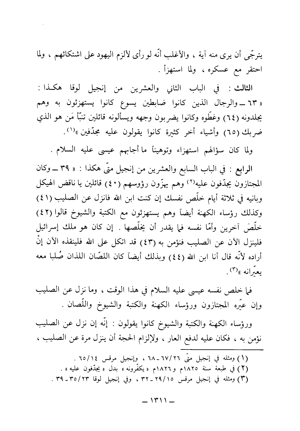 (الرابع) في الباب السابع والعشرين من إنجيل متى هكذا: 39 (وكان المجتازون يجدفون عليه، وهم يهزؤن رؤوسهم) 40 (قائلين يا ناقض الهيكل وبانيه في ثلاثة أيام، خلص نفسك إن كنت ابن الله فانزل الآن عن الصليب) 41 (وكذلك رؤساء الكهنة أيضاً وهم يستهزؤون مع الكتبة والشيوخ قالوا خلص آخرين وأما نفسه فما يقدر أن يخلصها إن كان هو ملك إسرائيل فلينزل الآن عن الصليب فنؤمن به) 43 (قد اتكل على الله فلينقذه الآن إن أراده لأنه قال أنا ابن الله) 44 (وبذلك أيضاً كان اللصان اللذان صلبا معه ليعيرانه) فما خلص نفسه عيسى عليه السلام في هذا الوقت، وما نزل عن الصليب وإن عيره المجتازون، ورؤساء الكهنة، والكتبة، والشيوخ، واللصان. ورؤساء الكهنة، والكتبة، والشيوخ كانوا يقولون إنه إن نزل عن الصليب نؤمن به، فكان عليه لدفع العار، ولإلزام الحجة أن ينزل مرة عن الصليب