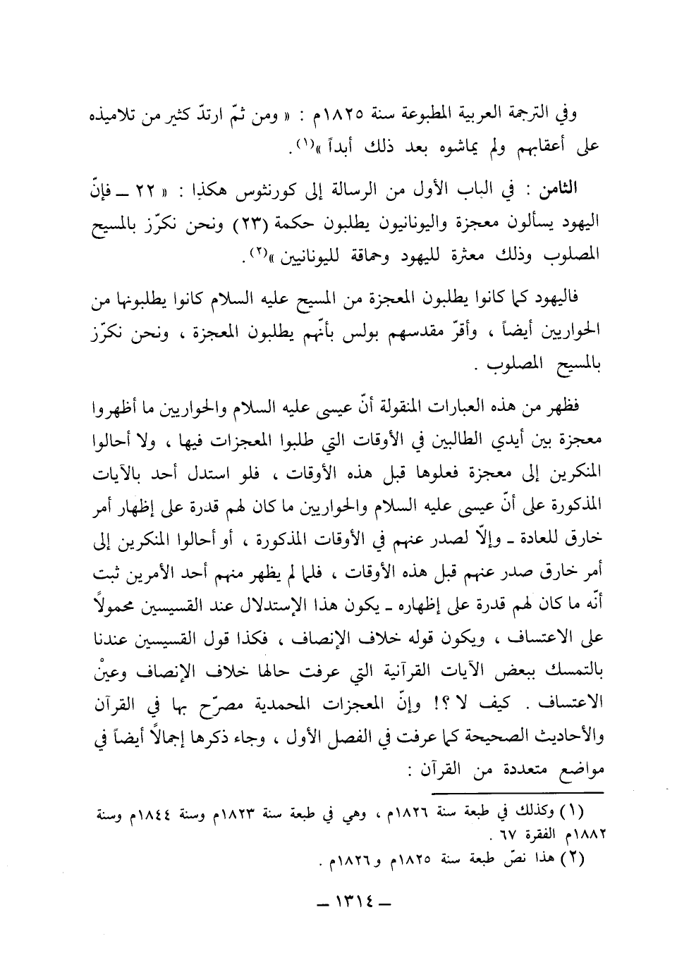 (الثامن) في الباب الأول من الرسالة إلى أهل قورنيثوس هكذا: 22 (فإن اليهود يسألون معجزة واليونانيون يطلبون حكمة) 23 (ونحن نكرز بالمسيح المصلوب وذلك معثرة لليهود وحماقة لليونانيين) . فاليهود كما كانوا يطلبون المعجزة من المسيح عليه السلام كانوا يطلبونها من الحواريين أيضاً، وأقر مقدسهم بولس بأنهم يطلبون المعجزة ونحن نكرز بالمسيح المصلوب. فظهر من هذه العبارات المنقولة أن عيسى عليه السلام والحواريين ما أظهروا معجزة بين أيدي الطالبين في الأوقات التي طلبوا المعجزات فيها، ولا أحالوا المنكرين إلى معجزة فعلوها قبل هذه الأوقات، فلو استدل أحد بالآيات المذكورة على أن عيسى عليه السلام والحواريين، ما كان لهم قدرة على إظهار أمر خارق للعادات، وإلا لصدر عنهم في الأوقات المذكورة وأحالوا المنكرين إلى أمر خارق صدر عنهم قبل هذه الأوقات. فلما لم يظهر منهم أحد الأمرين ثبت أنهم ما كان لهم قدرة على إظهاره، يكون هذا الاستدلال عند القديسين محمولاً على الاعتساف ويكون قوله خلاف الإنصاف، فكذا قول القسيسين عندنا بالتمسك ببعض الآيات القرآنية التي عرفت حالها خلاف الإنصاف وعين الاعتساف، كيف لا وأن المعجزات المحمدية مصرح بها في القرآن والأحاديث الصحيحة، كما عرفت في الفصل الأول وجاء ذكرها إجمالاً أيضاً في مواضع متعددة من القرآن: