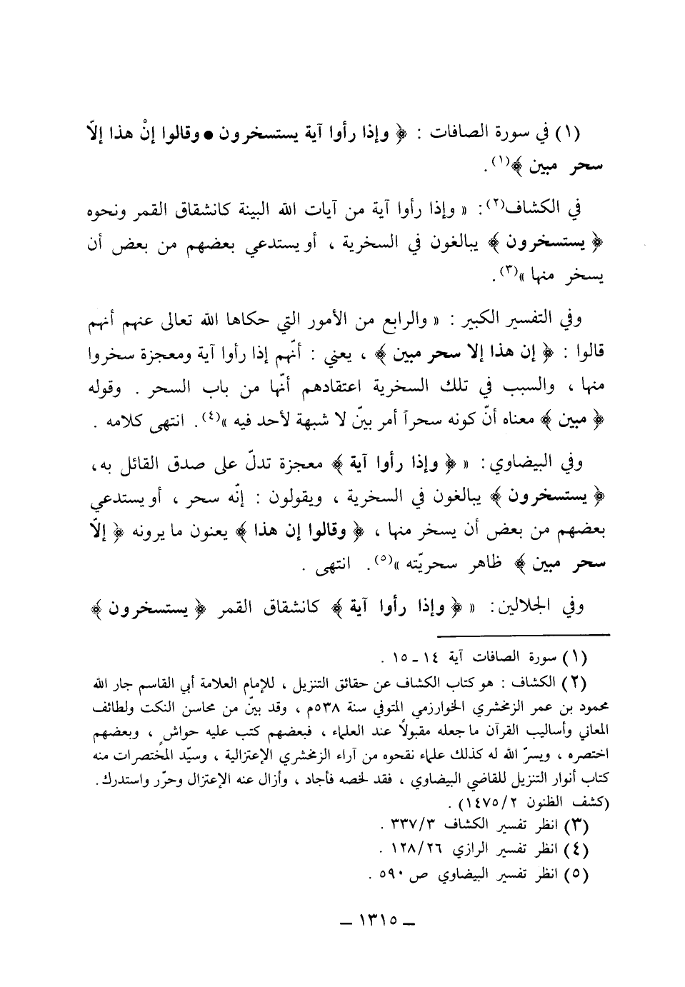 1- في سورة الصافات: {وإذا رأوا آية يستسخرون وقالوا إن هذا إلا سحر مبين) .. في الكشاف {وإذا رأوا آية} من آيات الله البينة كانشقاق القمر ونحوه {يستسخرون} يبالغون في السخرية أو يستدعي بعضهم من بعض أن يسخر منها.. وفي التفسير الكبير: (والرابع من الأمور التي حكاها الله تعالى عنهم أنهم قالوا إن هذا إلا سحر مبين، يعني أنهم إذا رأوا آية ومعجزة سخروا منها، والسبب في تلك السخرية اعتقادهم أنها من باب السحر، وقوله مبين: معناه أن كونه سحراً أمر بين لا شبهة لأحد فيه) انتهى كلامه.. وفي البيضاوي: {وإذا رأوا آية} تدل على صدق القائل {يستسخرون} يبالغون في السخرية ويقولون إنه سحر أو يستدعي بعضهم من بعض أن يسخر منها {وقالوا إن هذا} يعنون ما يرونه {إلا سحر مبين} ظاهر سحريته انتهى.. وفي الجلالين {وإذا رأوا آية} كانشقاق القمر {يستسخرون}