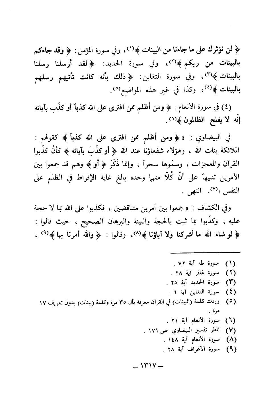 {لن نؤثرك على ما جاءنا من البينات} ، وفي سورة المؤمن: {وقد جاءكم بالبينات من ربكم} ، وفي سورة الحديد: {لقد أرسلنا رسلنا بالبينات} ، وفي سورة التغابن: {ذلك بأنه كانت تأتيهم رسلهم بالبينات} وكذا في غير هذه المواضع.