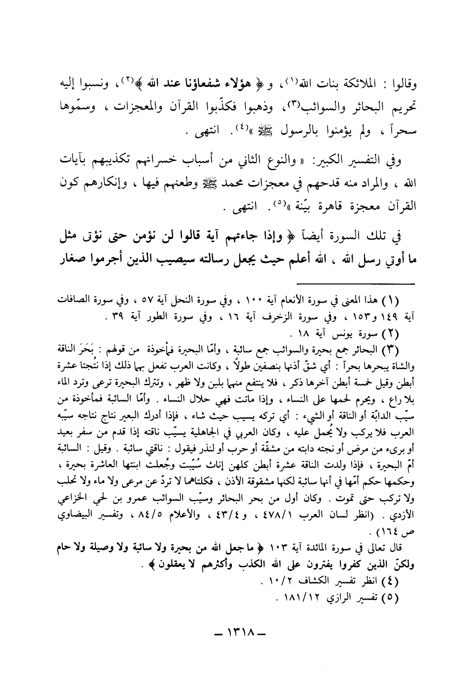 وقالوا الملائكة بنات الله وهؤلاء شفعاؤنا عند الله، ونسبوا إليه تحريم البحائر والسوائب، وذهبوا فكذبوا بالقرآن والمعجزات، وسموها سحراً ولم يؤمنوا بالرسول، انتهى.