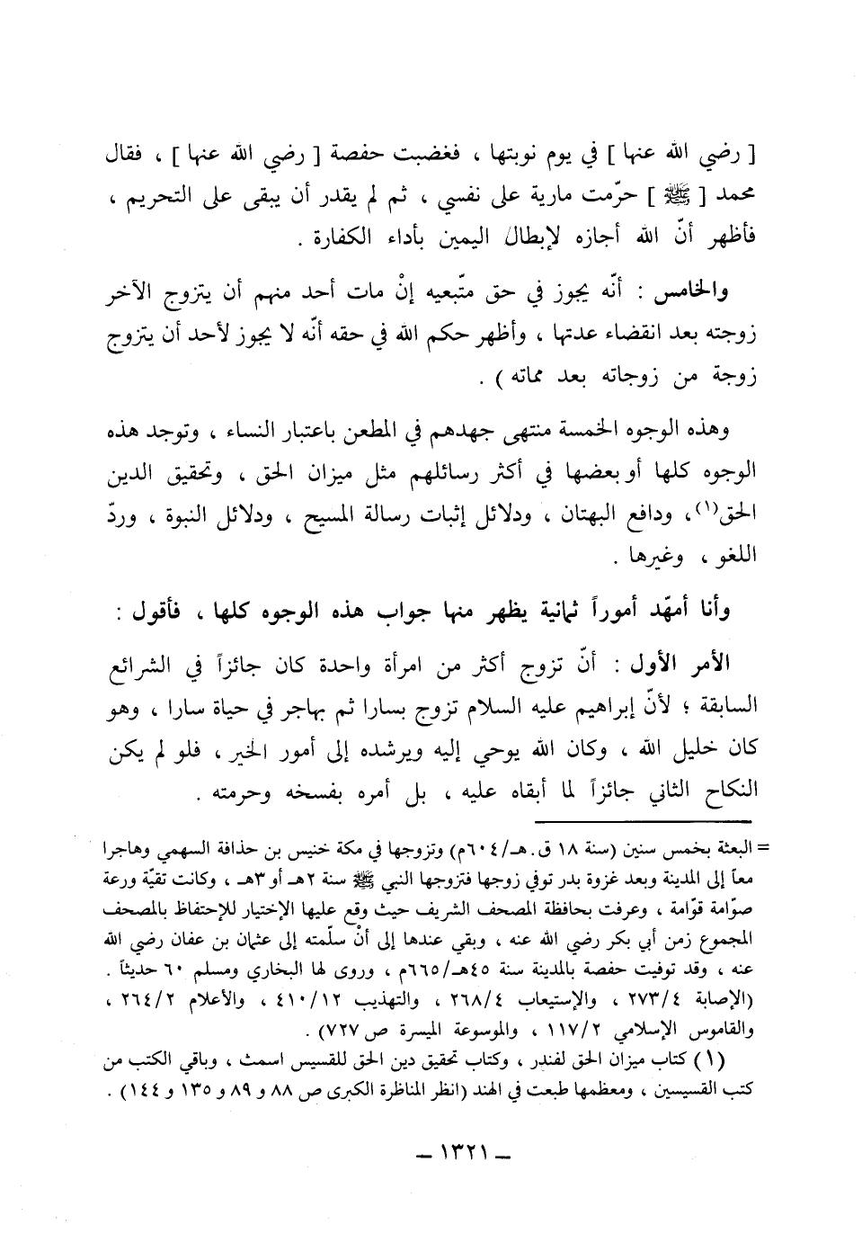 وهذه الوجوه الخمسة منتهى جهدهم في المطعن باعتبار النساء. وتوجد هذه الوجوه كلها أو بعضها في أكثر رسائلهم مثل ميزان الحق، وتحقيق الدين الحق، ودافع البهتان، ودلائل إثبات رسالة المسيح، ودلائل النبوة، ورد اللغو وغيرها. وأنا أمهد أموراً ثمانية يظهر منها جواب هذه الوجوه كلها فأقول: