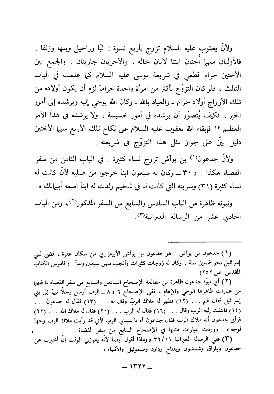 ولأن جدعون بن يواش تزوج نساء كثيرة في الباب الثامن من سفر القضاة هكذا: 30 (وكان له سبعون ابناً خرجوا من صلبه لأن كانت له نساء كثيرة) 31 (وسريته التي كانت له في شخيم ولدت له ابناً اسمه ابيمالك) . ونبوته ظاهرة من الباب السادس والسابع من السفر المذكور، ومن الباب الحادي عشر من الرسالة العبرانية.
