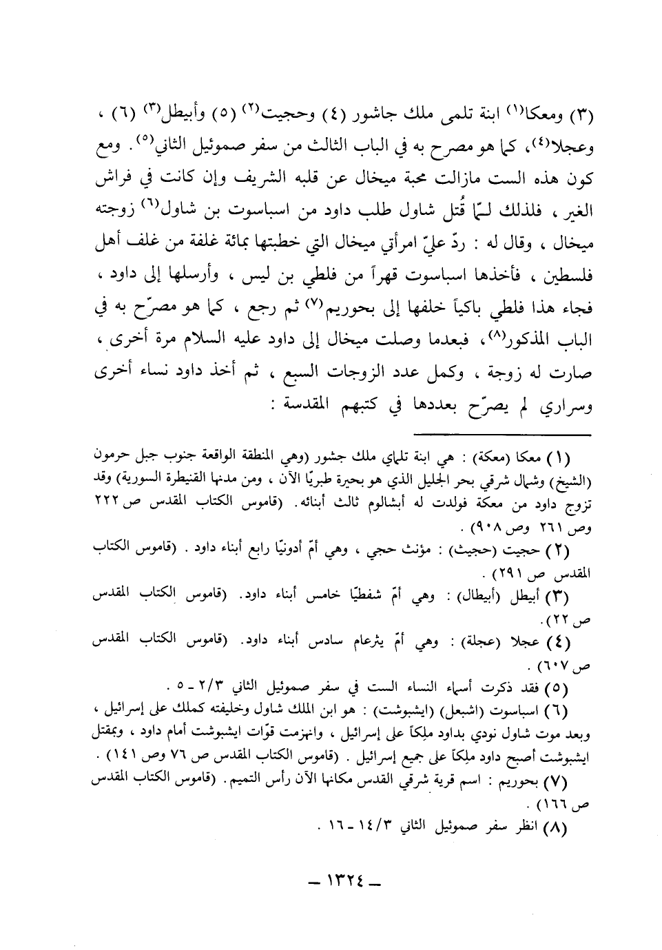 ومعهما ابنة تلمى ملك جاشور 3 وحجبت 4 وابيطل 5 وعجلا 6 - كما هو مصرح به في الباب الثالث من سفر صموئيل الثاني. ومع كون هذه الست، ما زالت محبة ميخال عن قلبه الشريف، وإن كانت في فراش الغير فلذلك لما قتل شاوول، طلب داود من اسباسوت بن شاوول زوجته ميخال، وقال له: رد على امرأتي ميخال التي خطبتها بمائة غلفة من غلف أهل فلسطين. فأخذها أسباسوت قهراً من فلطى بن ليس وأرسلها إلى داود، فجاء هذا فلطى باكياً خلفها إلى بحوريم ثم رجع. كما هو مصرح به في الباب المذكور. فبعد ما وصلت ميخال إلى داود عليه السلام مرة أخرى صارت له زوجة، وكمل عدد الزوجات السبع، ثم أخذ داود نساء أخرى، وسراري لم يصرح بعددها في كتبهم المقدسة..