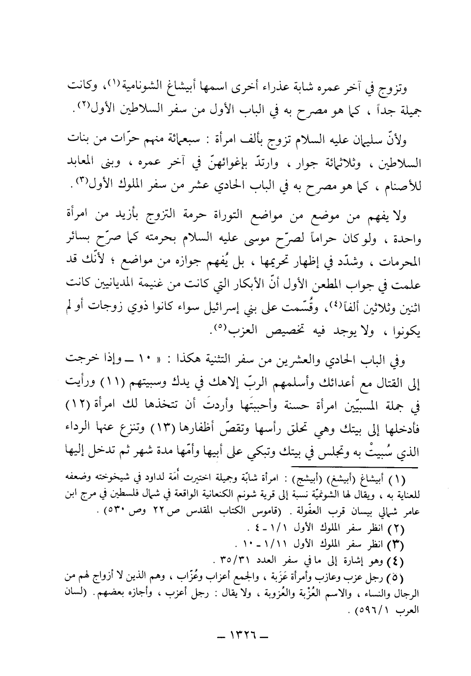 ولأن سليمان عليه السلام، تزوج بألف امرأة، سبعمائة منهن حرات من بنات السلاطين وثلثمائة جوار. وارتد بإغوائهن في آخر عمره وبنى المعابد للأصنام، كما هو مصرح به في الباب الحادي عشر من سفر الملوك الأول.