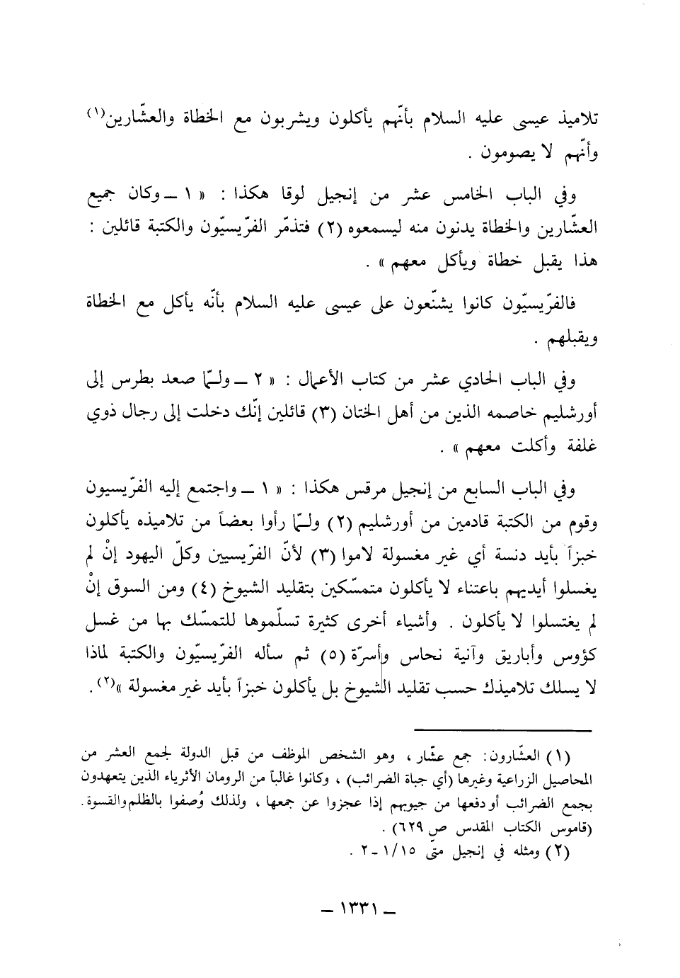 تلاميذ عيسى عليه السلام بأنهم يأكلون ويشربون مع الخطاة والعشارين وأنهم لا يصومون) .