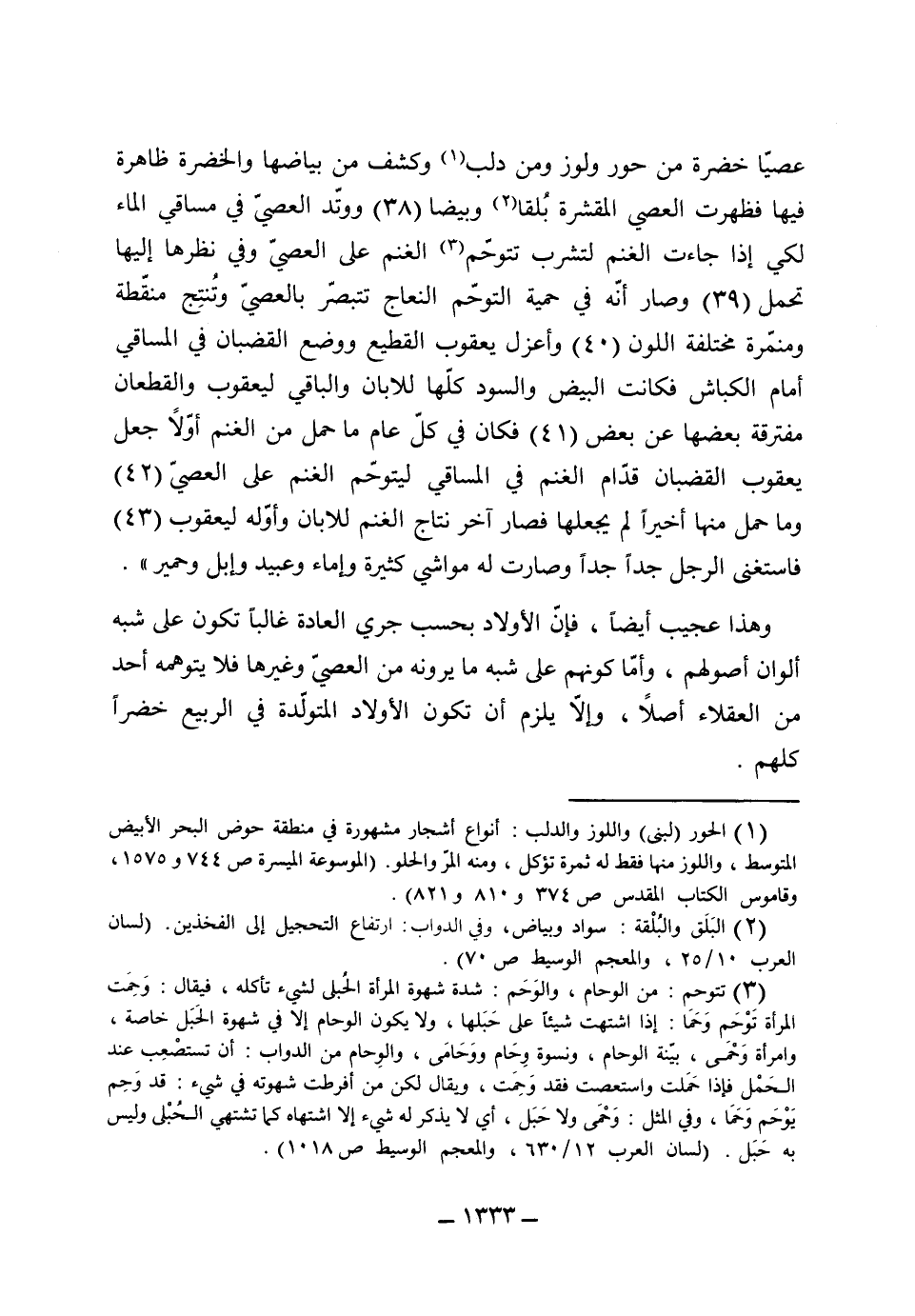وهذا عجيب أيضاً، فإن الأولاد بحسب جرى العادة، غالباً تكون على شبه ألوان أصولهم، وأما كونهم على شبه ما يرونه من العصى وغيرها، فلا يتوهمه أحد من العقلاء أصلاً، وإلا يلزم أن يكون الأولاد المتولدة في الربيع خضراً كلهم.