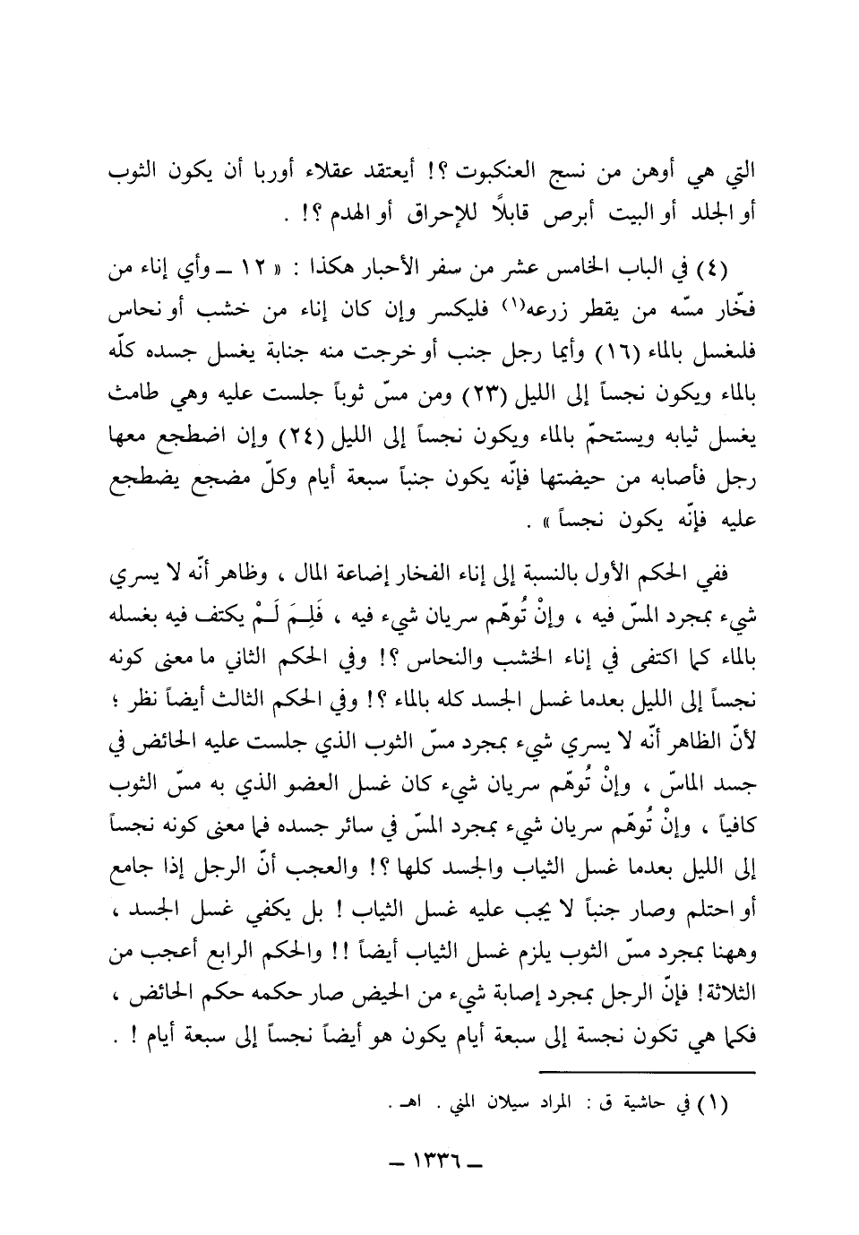 ففي الحكم الأول بالنسبة إلى إناء الفخار إضاعة المال، وظاهر أنه لا يسري شيء بمجرد المس فيه وإن توهم سريان شيء فيه، فَلِمَ لَمْ يكتف فيه بغسله بالماء، كما اكتفى في إناء الخشب، والنحاس. وفي الحكم الثاني ما معنى كونه نجساً إلى الليل بعد ما غسل الجسد كله بالماء. وفي الحكم الثالث أيضاً نظر لأن الظاهر أنه لا يسري شيء بمجرد مس الثوب، الذي جلست عليه الحائض في جسد الماس، وإن توهم سريان شيء، كان غسل العضو الذي به مس الثوب كافياً، وإن توهم سريان شيء بمجرد المس في سائر جسده، فما معنى كونه نجساً إلى الليل، بعد ما غسل الثياب، والجسد كلها، والعجب أن الرجل إذا جامع، أو احتلم، وصار جنباً، لا يجب عليه غسل الثياب بل يكفي غسل الجسد. وههنا بمجرد مس الثوب يلزم غسل الثياب أيضاً. والحكم الرابع أعجب من الثلاثة فإن الرجل بمجرد إصابة شيء من الحيض بم صار حكمه حكم الحائض، فكما هي تكون نجسة إلى سبعة أيام يكون هو أيضاً نجساً إلى سبعة أيام،