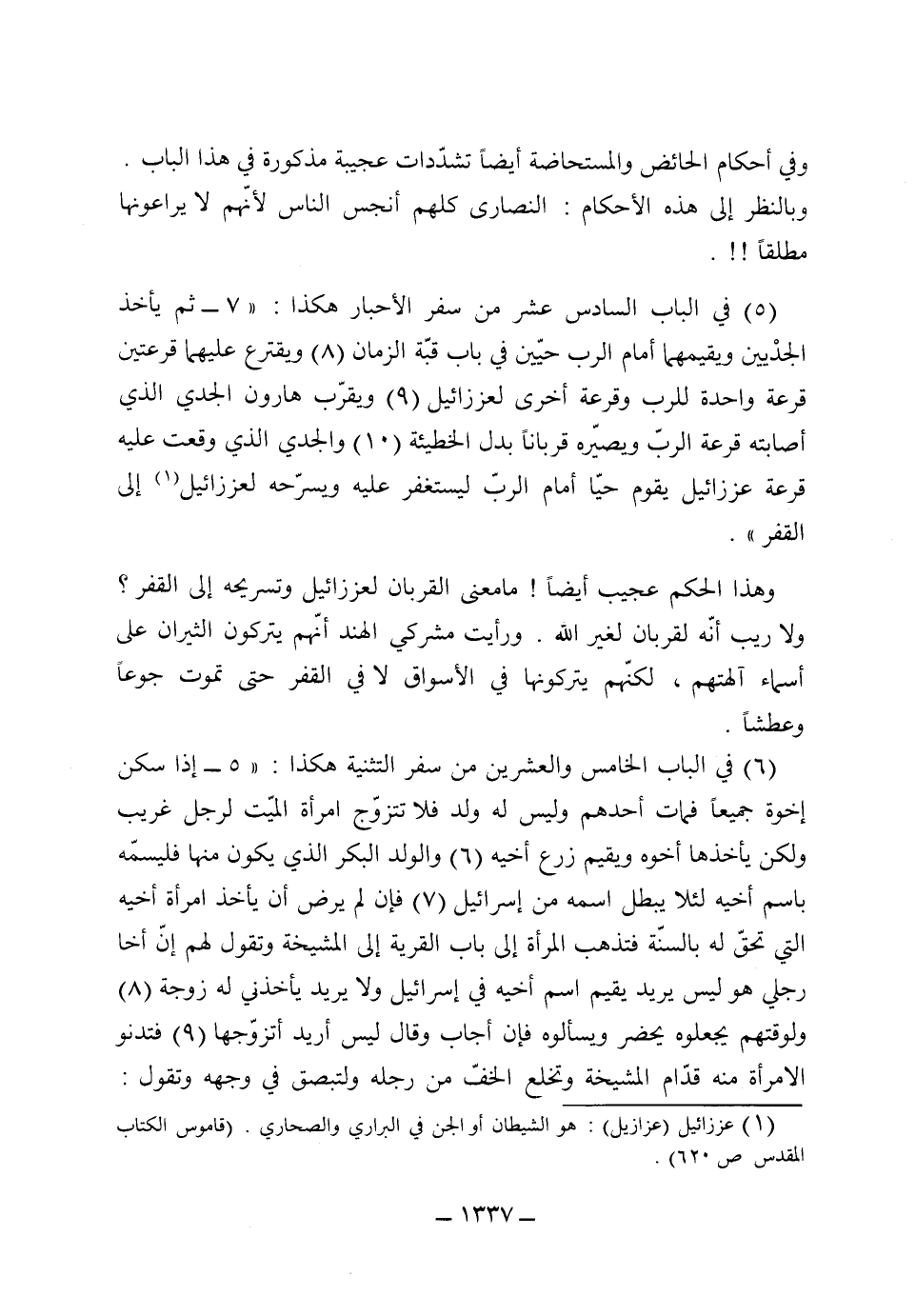 وهذا الحكم عجيب أيضاً، وما معنى القربان لعزرائيل وتسريحه إلى القفر، ولا ريب إنه لقربان لغير الله، ورأيت مشركي الهند أنهم يتركون الثيران على أسماء آلهتهم، لكنهم يتركونها في الأسواق لا في القفر حتى تموت جوعاً وعطشاً.