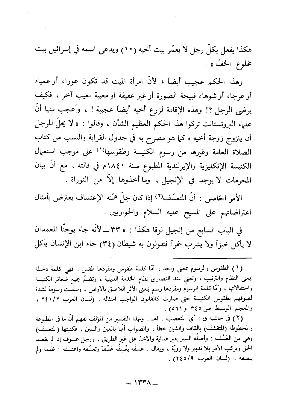 وهذا الحكم عجيب أيضاً، لأن امرأة الميت، قد تكون عوراء، أو عمياء، أو عرجاء، أو شوهاء قبيحة الصورة، أو غير عفيفة، أو معيبة بعيب آخر، فكيف يرضى بها الرجل، وهذه الإقامة لزرع أخيه أيضاً عجيبة، وأعجب منها أن علماء بروتستنت تركوا هذا الحكم العظيم الشأن وقالوا: (لا يحل للرجل أن يتزوج زوجة أخيه) . كما هو مصرح به في جدول القرابة والنسب، من كتاب الصلاة العامة، وغيرها من رسوم الكنيسة وطقوسها، على موجب استعمال الكنيسة الإنكليزية والأرلندية المطبوع سنة 1840 في قالته، مع أن بيان المحرمات، لا يوجد في الإنجيل، وما أخذوها إلا من التوراة.
