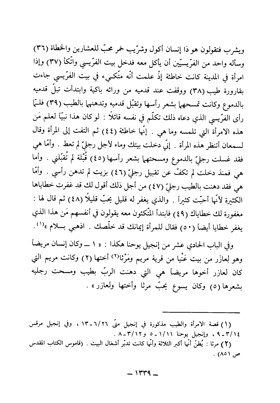 ويشرب فتقولون هو ذا إنسان أكول وشريب خمر محب للعشارين والخطاة) 36 (وسأله واحد من الفريسيين أن يأكل معه فدخل بيت الفريسي واتكأ) 37 (وإذا امراة في المدينة كانت خاطئة إذ علمت أنه متكئ في بيت الفريسي جاءت بقارورة طيب) 38 (ووقفت عند قدميه من ورائه باكية وابتدأت تبل قدميه بالدموع وكانت تمسحهما بشعر رأسها وتقبل قدميه وتدهنهما بالطيب) 39 (فلما رأى الفريسي الذي دعاه ذلك تكلم في نفسه قائلاً لو كان هذا نبياً لعلم مَنْ هذه الامرأة التي تلمسه وما هي إنها خاطئة) 44 (ثم التفت إلى المرأة وقال لسمعان انتظر هذه المرأة أني دخلت بيتك وماء لأجل رجلي لم تعط وأما هي فقد غسلت رجلي بالدموع ومسحتهما بشعر رأسها) 45 (قبلة لم تقبلني وأما هي فمنذ دخلت لم تكف عن تقبيل رجلي) 46 (بزيت لم تدهن رأسي وأما هي فقد دهنت بالطيب رجلي) 47 (من أجل ذلك أقول قد غفرت خطاياها الكثيرة لأنها أحبت كثيراً والذي يغفر له قليل يحب قليلاً) 48 (ثم قال لها مغفور لك خطاياك) 49 (فابتدأ المتكؤون معه يقولون في أنفسهم من هذا الذي يغفر خطايا أيضاً) 50 (فقال للمراة إيمانك قد خلصك اذهبي بسلام) .