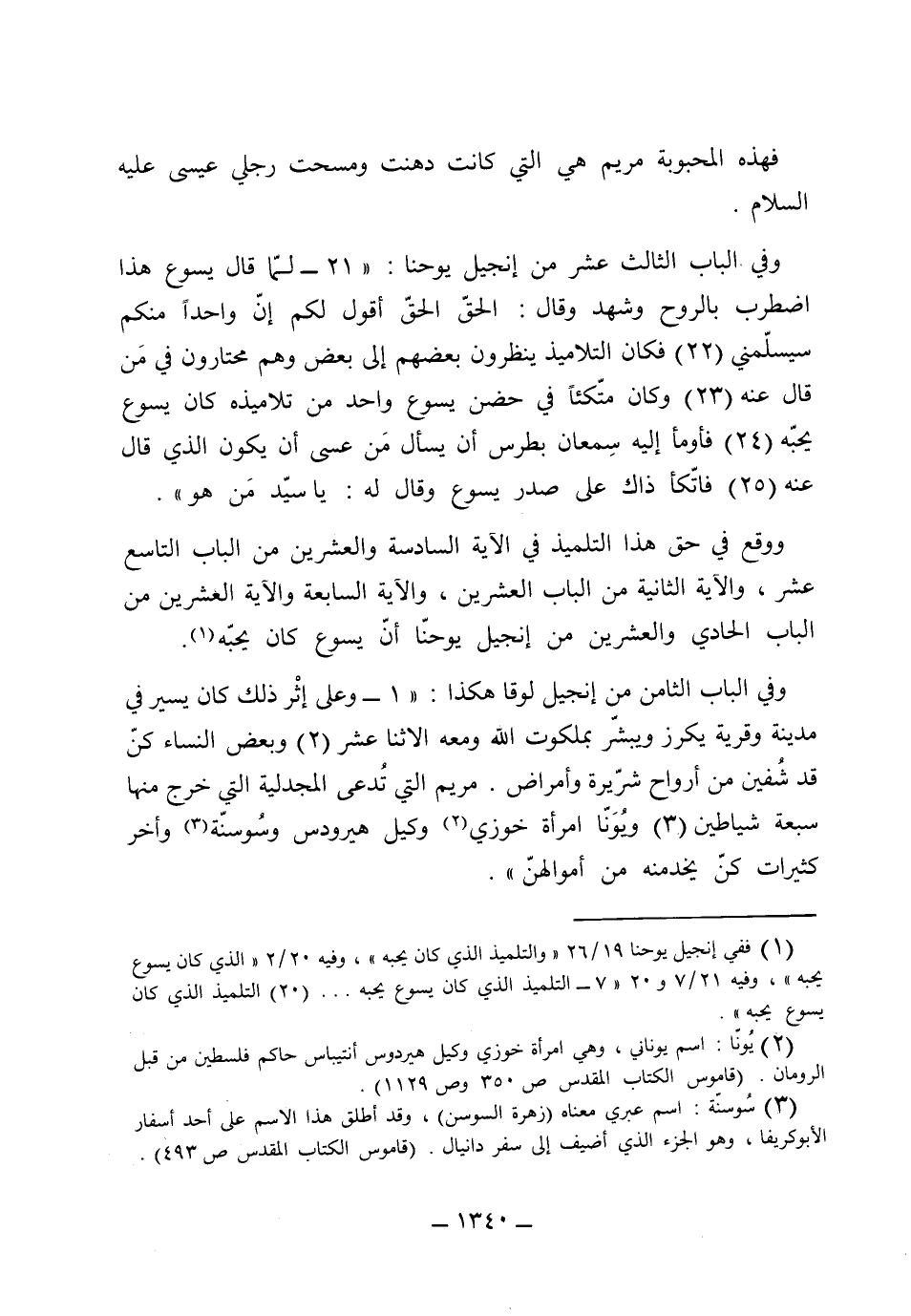 وفي الباب الثالث عشر من إنجيل يوحنا: 21 (لما قال يسوع هذا اضطرب بالروح وشهد وقال الحق الحق أقول لكم أن واحداً منكم سيسلمني) 22 (فكان التلاميذ ينظرون بعضهم إلى بعض وهم محتارون فيمن قال عنه) 23 (وكان متكئاً في حضن يسوع واحد من تلاميذه كان يسوع يحبه) 24 (فأومأ إليه سمعان بطرس أن يسأل من عسى أن يكون الذي قال عنه) 25 (فاتكأ ذاك على صدر يسوع وقال له يا سيد من هو) . ووقع في حق التلميذ، في الآية السادسة والعشرين من الباب التاسع عشر، والآية الثانية من الباب العشرين، والآية السابعة والآية العشرين من الباب الحادي والعشرينمن إنجيل يوحنا، أن يسوع كان يحبه.