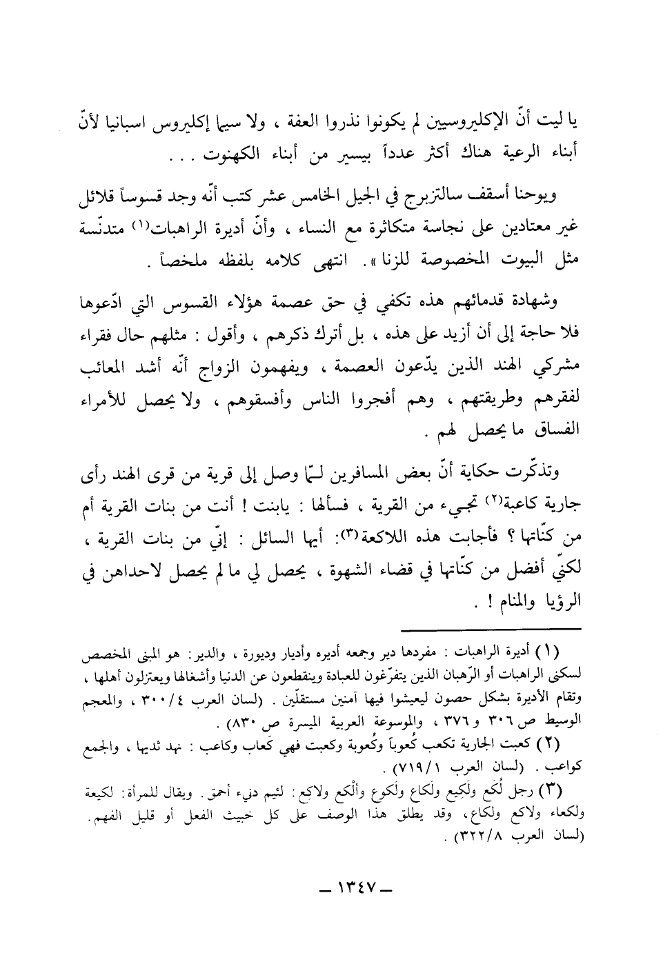 وشهادة قدمائهم هذه، تكفي في حق عصمة هؤلاء القسوس التي ادعوها، فلا حاجة إلى أن أزيد على هذه، بل أترك ذكرهم وأقول: مثلهم حال فقراء مشركي الهند الذين يدعون العصمة، ويفهمون الزواج أنه أشد المعائب لفقرهم وطريقتهم، وهم أفجر الناس وأفسقهم، لا يحصل للأمراء الفساق ما يحصل لهم.