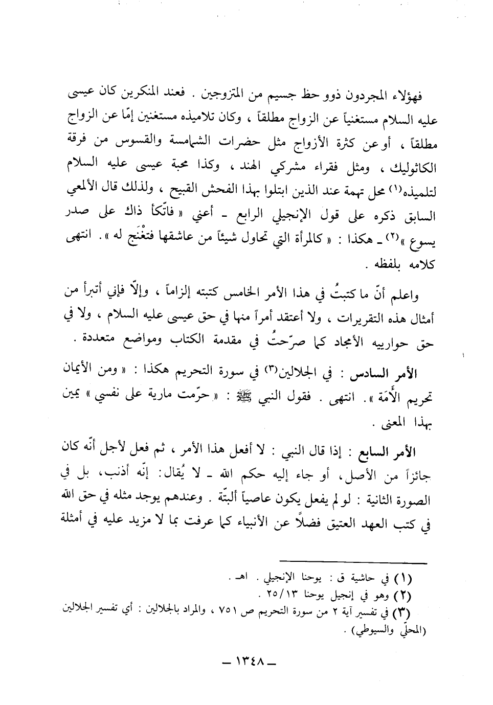 فهؤلاء المجردون ذوو حظ جسيم من المتزوجين، فعند المنكرين كان عيسى عليه السلام، مستغنياً عن الزواج مطلقاً، وكان تلاميذه مستغنين إما عن الزواج مطلقاً، أو عن كثرة الأزواج مثل حضرات الشمامسة والقسوس من فرقة كاتلك، ومثل فقراء مشركي الهند. وكذا محبة عيسى عليه السلام لتلميذه، محل تهمة عند الذين ابتلوا بهذا الفحش القبيح.