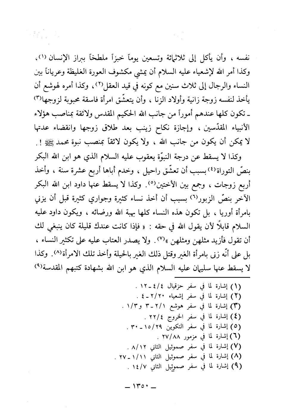نفسه، وأن يأكل إلى ثلثمائة وتسعين يوماً، خبزاً ملطخاً ببراز الإنسان. وكذا أمر الله لأشعيا عليه السلام، أن يمشي مكشوف العورة الغليظة، وعرياناً بين النساء والرجال إلى ثلاث سنين، مع كونه في قيد العقل. وكذا أمره لهوشع أن يأخذ لنفسه زوجة زانية وأولاد الزنا، وأن يتعشق بامرأة فاسقة محبوبة لزوجها. يكون كلها عندهم أموراً من جانب الله الحكيم المقدس، ولائقاً بمناصب هؤلاء الأنبياء المقدسين. وإجازة نكاح زينب بعد طلاق زوجها وانقضاء عدتها لا يمكن أن يكون من جانب الله، ولا يكون لائقاً بمنصب نبوة محمد صلى الله عليه وسلم. وكذا لا يسقط عن درجة النبوة، يعقوب عليه السلام الذي هو ابن الله البكر بنص التوراة، بسبب أن تعشق راحيل، وخدم أباها أربع عشرة سنة، وأخذ أربع زوجات، وجمع بين الأختين، وكذا لا يسقط عنها داود ابن الله البكر الآخر، بنص الزبور، بسبب أن أخذ نساء كثيرة، وجواري كثيرة، قبل أن يزني بامرأة أوريا بل تكون هذه النساء كلها بهبة الله ورضاه، ويكون داود عليه السلام قابلاً لأن يقول الله في حقه: فإذا كانت عندك قليلة كان ينبغي لك أن تقول فأزيد مثلهن. ولا يصدر العتاب عليه على تكثير النساء، بل على أنه زنى بامرأة الغير، وقتل ذلك الغير بالحيلة، وأخذ تلك الامرأة.