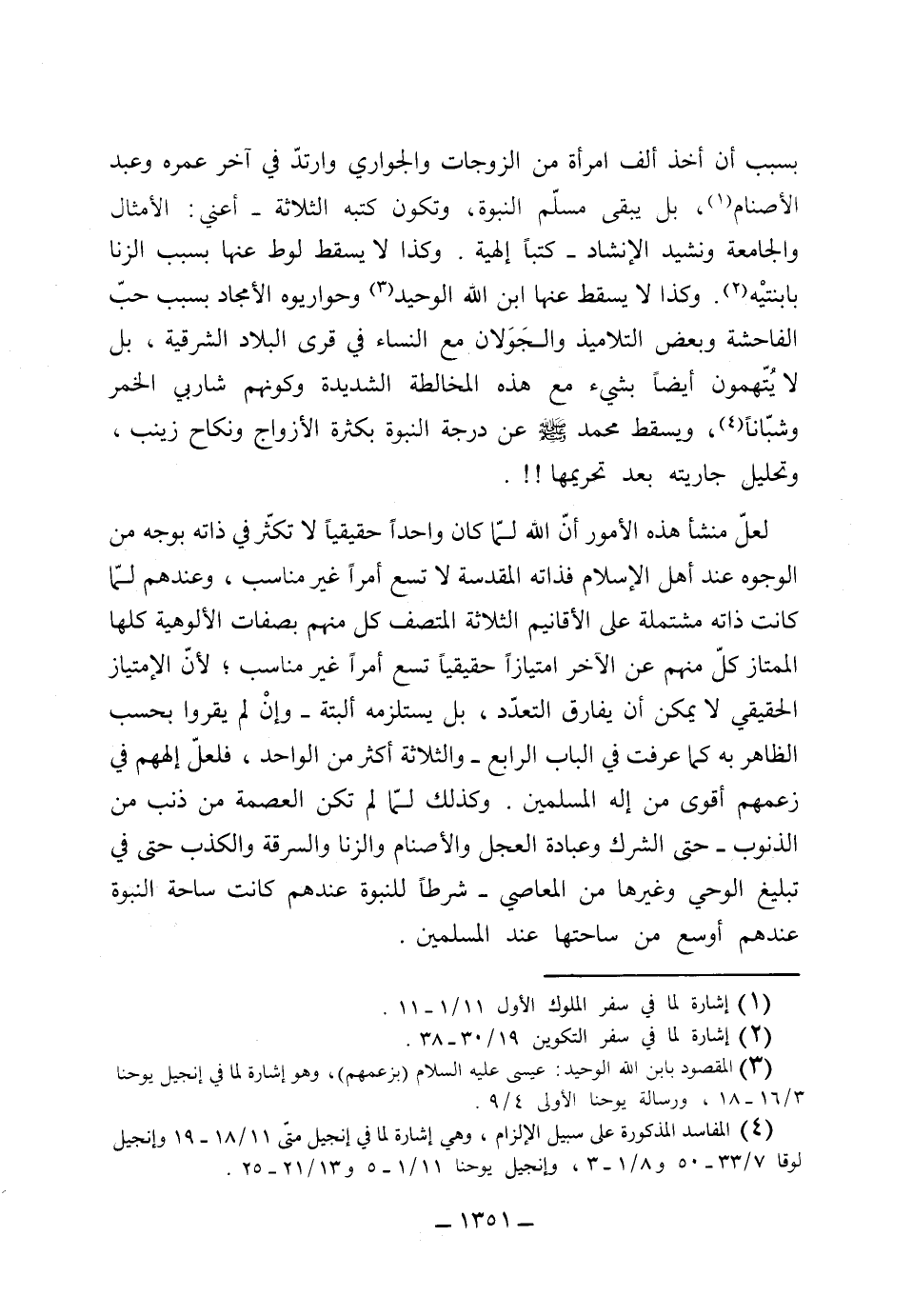 بسبب أن أخذ ألف امرأة من الزوجات والجواري، وارتد في آخر عمره وعبد الأصنام، بل يبقى مسلم النبوة ويكون كتبه الثلاثة، أعني الأمثال والجامعة ونشيد الإنشاد، كتباً إلهية. وكذا لا يسقط لوط عنها، بسبب الزنا بابنتيه. وكذا لا يسقط عنها ابن الله الوحيد وحواريه الأمجاد، بسبب حب الفاحشة، وبعض التلاميذ، والجولان مع النساء في قرى البلاد الشرقية. بل لا يتهمون أيضاً بشيء مع هذه المخالطة الشديدة وكونهم شاربي الخمر وشباناً. ويسقط محمد صلى الله عليه وسلم عن درجة النبوة بكثرة الأزواج، ونكاح زينب، وتحليل جاريته بعد تحريمها. لعل منشأ هذه الأمور أن الله لما كان واحداً حقيقياً، لا تكثر في ذاته بوجه من الوجوه عند أهل الإسلام، فذاته المقدسة لا تسع أمراً غير مناسب، وعندهم لما كان ذاته مشتملة على الأقانيم الثلاثة المتصف كل منهم بصفات الألوهية كلها، الممتاز كل منهم عن الآخر امتيازاً حقيقياً تسع أمراً غير مناسب. لأن الامتياز الحقيقي، لا يمكن أن يفارق التعدد، بل يستلزمه البتة وإن لم يقروا بحسب الظاهر به، كما عرفت في الباب الرابع والثلاثة أكثر من الواحد.