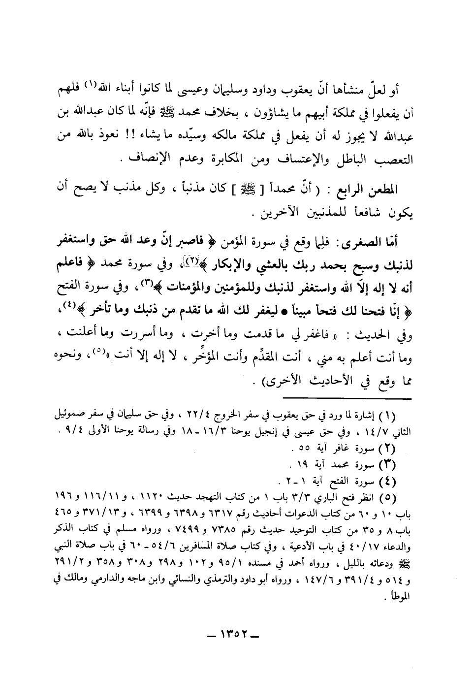 (المطعن الرابع) أن محمد صلى الله عليه وسلم كان مذنباً، وكل مذنب لا يصح أن يكون شافعاً للمذنبين الآخرين. أما الصغرى فلما وقع: